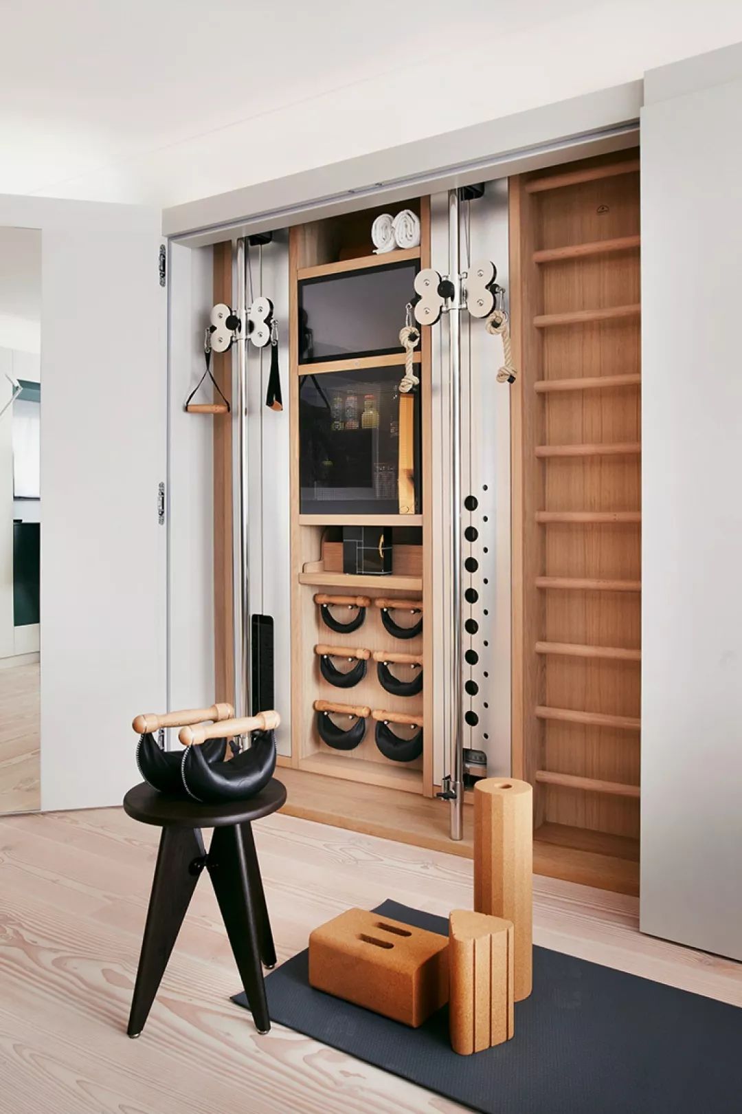 许多储物柜可以将器材隐藏,减少“健身房”的占地空间。