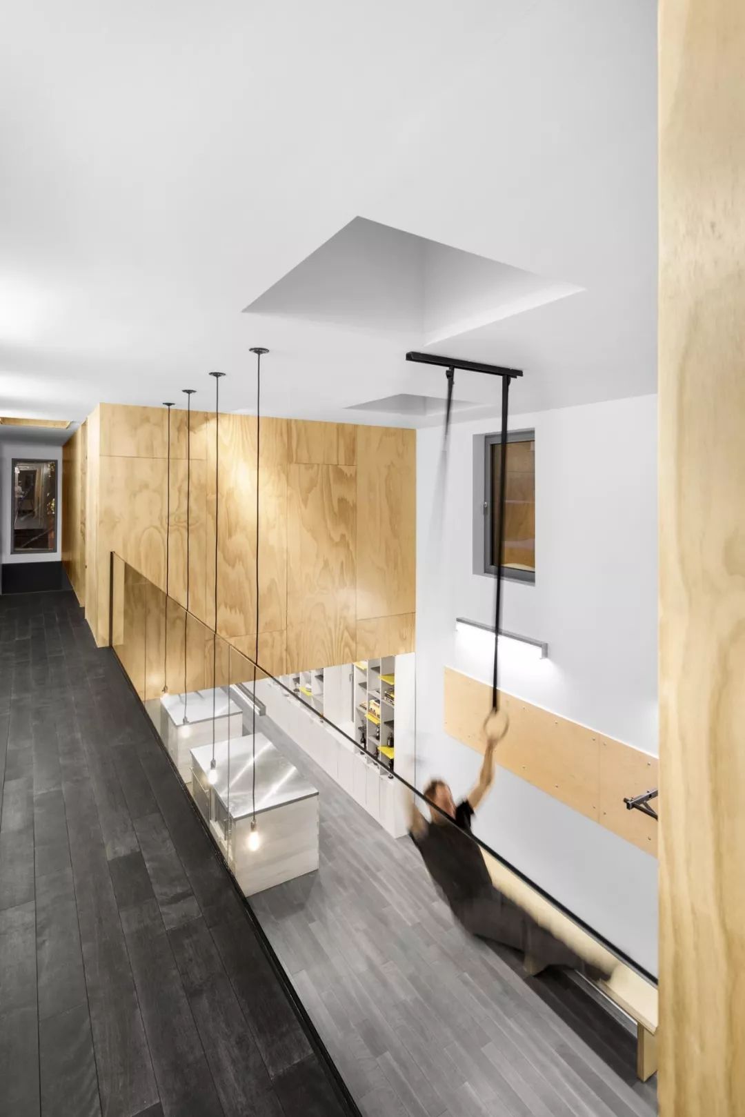 面积较大的住宅也可以选择挑高空间,打造半开放的健身区域。日本东部一个家庭就将入口大厅,改造成一个室内篮球场。