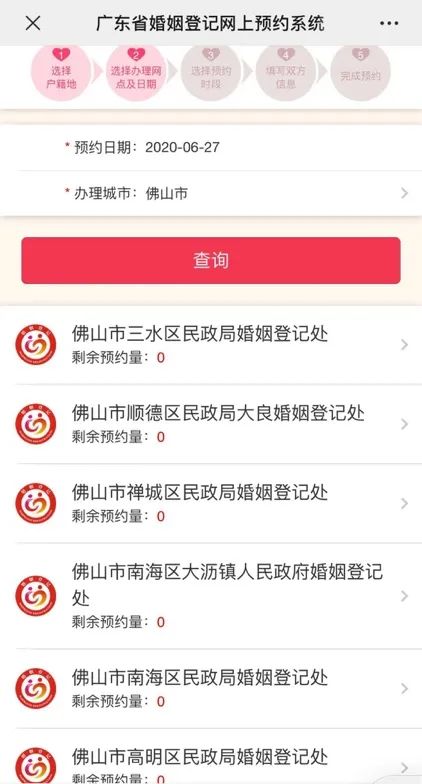 广东省婚姻登记网上预约系统显示:比起结婚登记预约,佛山的离婚预约情况真的可以说爆满!点进去一看发现佛山的离婚排期选到能预约的到6月27号,剩余号数还是为0!