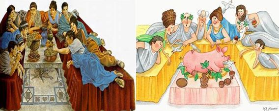其实早在西方的古罗马时期,他们的饮食卫生习惯与我们非常相似,甚是不堪入目,他们是趴着吃东西,为的是吃撑了之后便于呕吐。当然他们不会像我们一样搞一些高深的数学划拳游戏,顶多就是聊聊邻家的美女罢了。