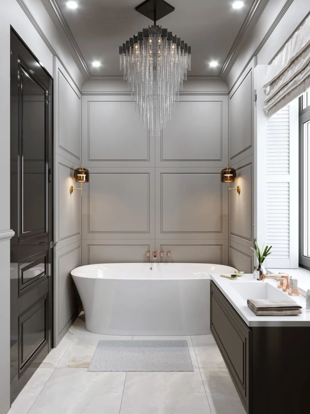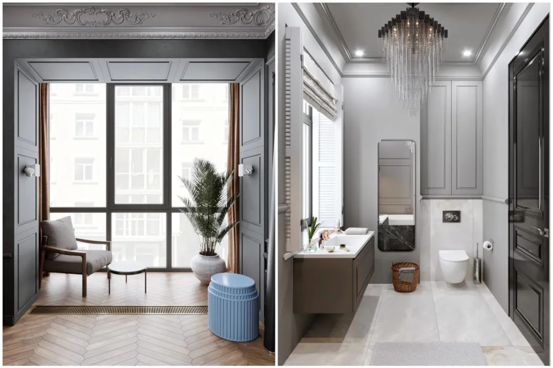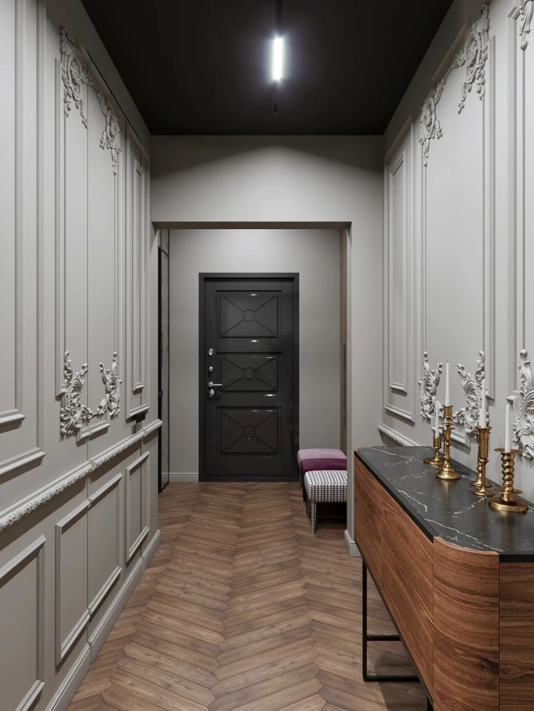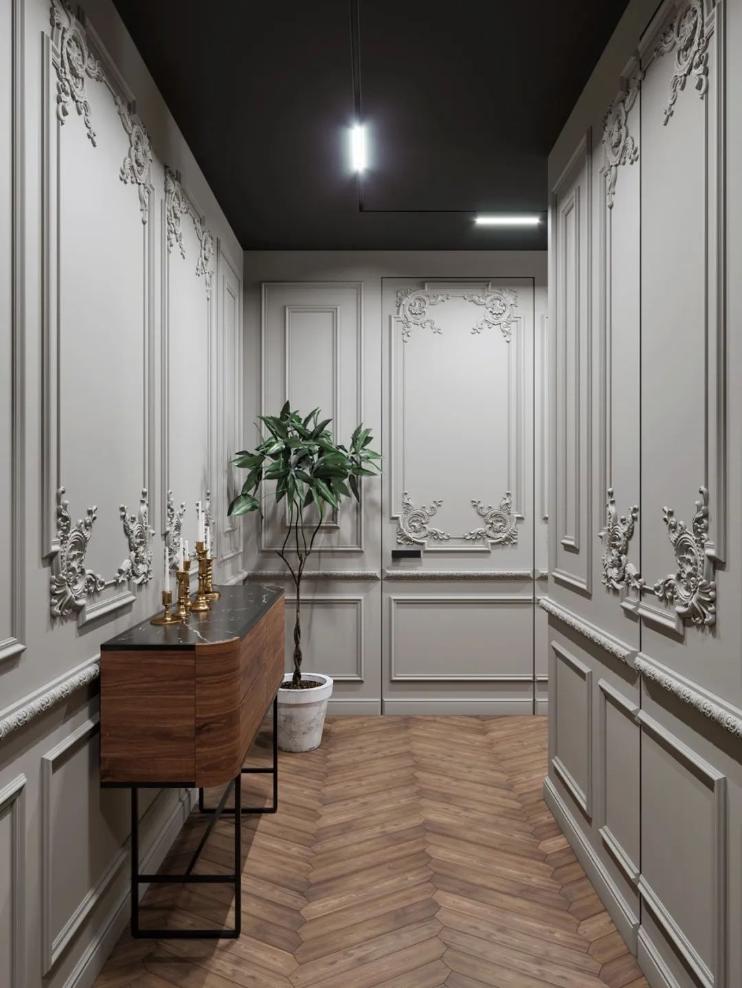过道被设计成一个神奇的区域,欧式的护墙板里其实包含了通往不同空间的门,隐藏式的门体设计,让空间整体而统一。