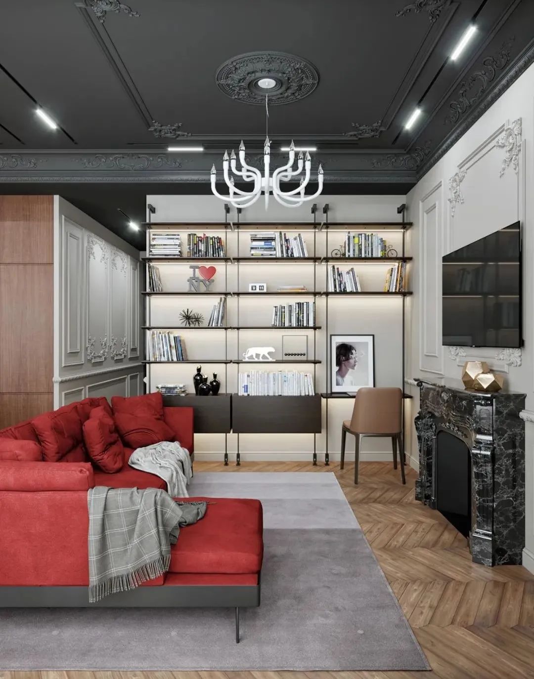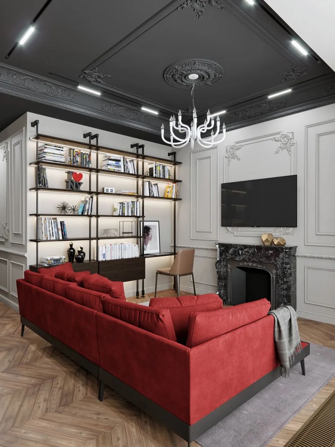 热情洋溢的红色沙发,透露出魅惑的情趣,黑色轻盈的铁艺书架又增添些许文艺范儿。大理石仿真壁炉更是优雅的代名词。