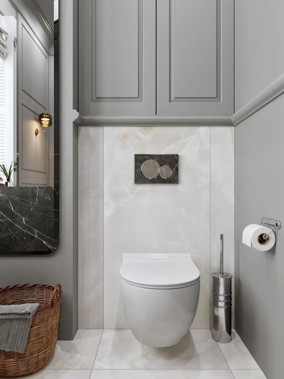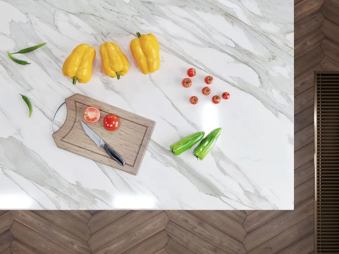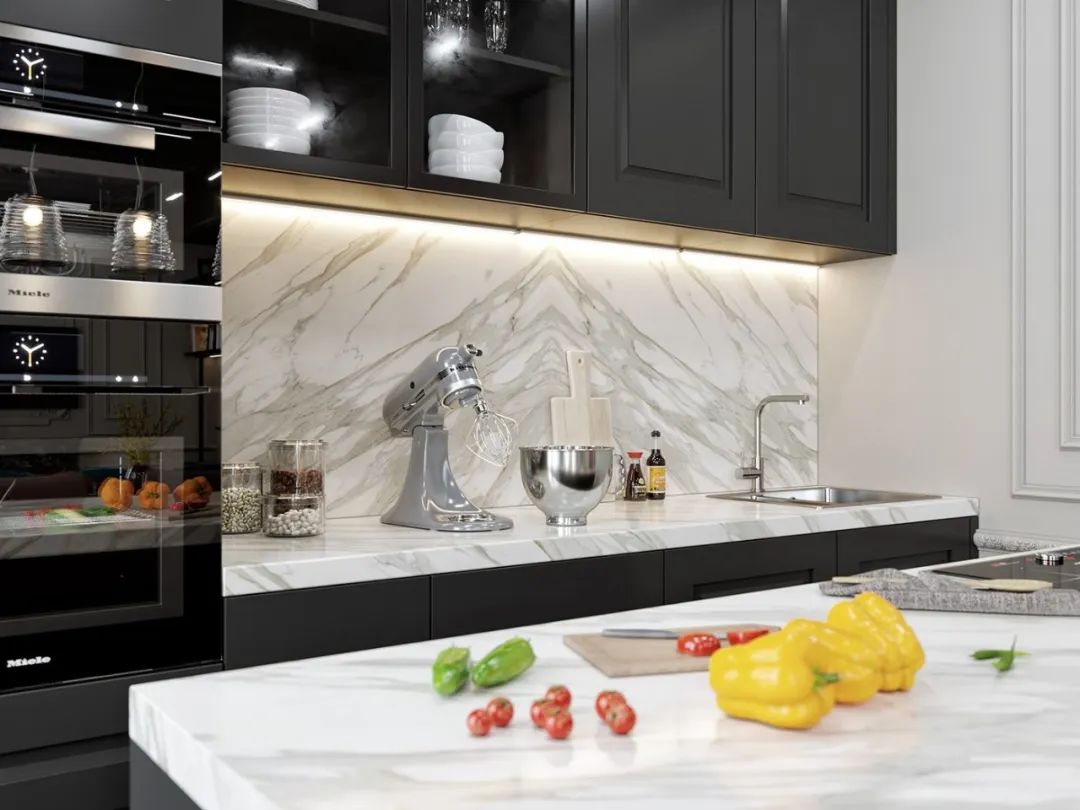 厨房采用一整块的大理石瓷砖,花纹对称排列,像一幅幅精美的艺术品,让这烟火之地也倍显清雅。