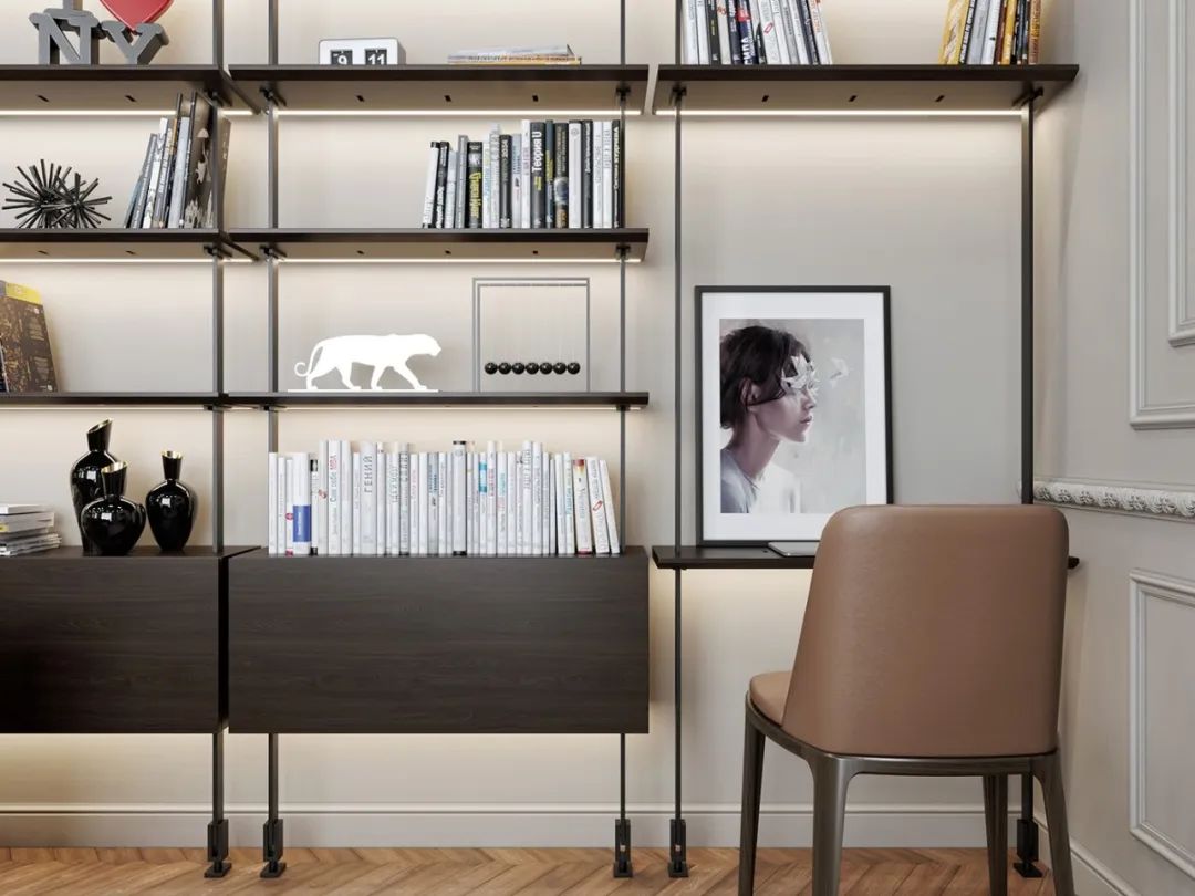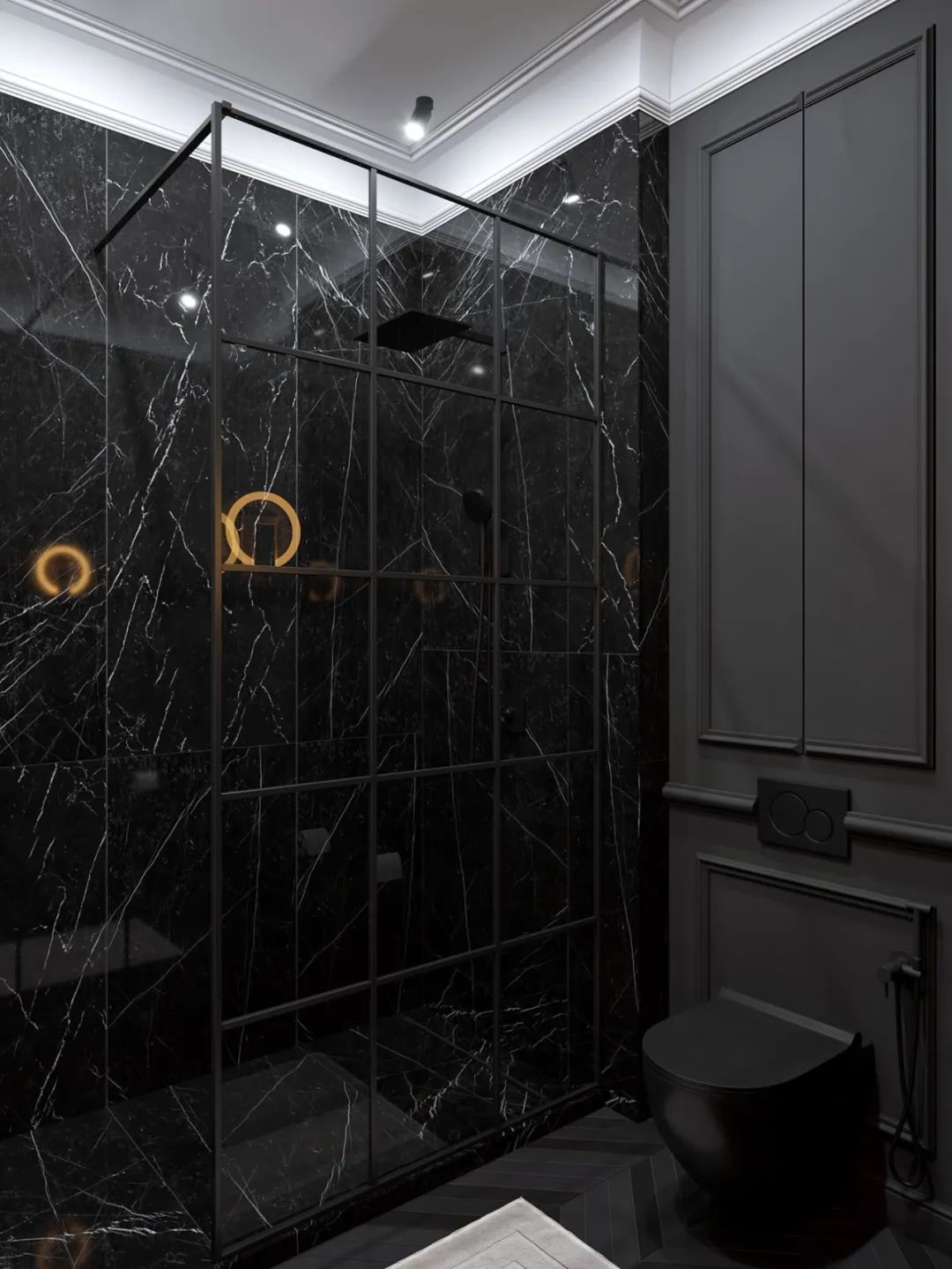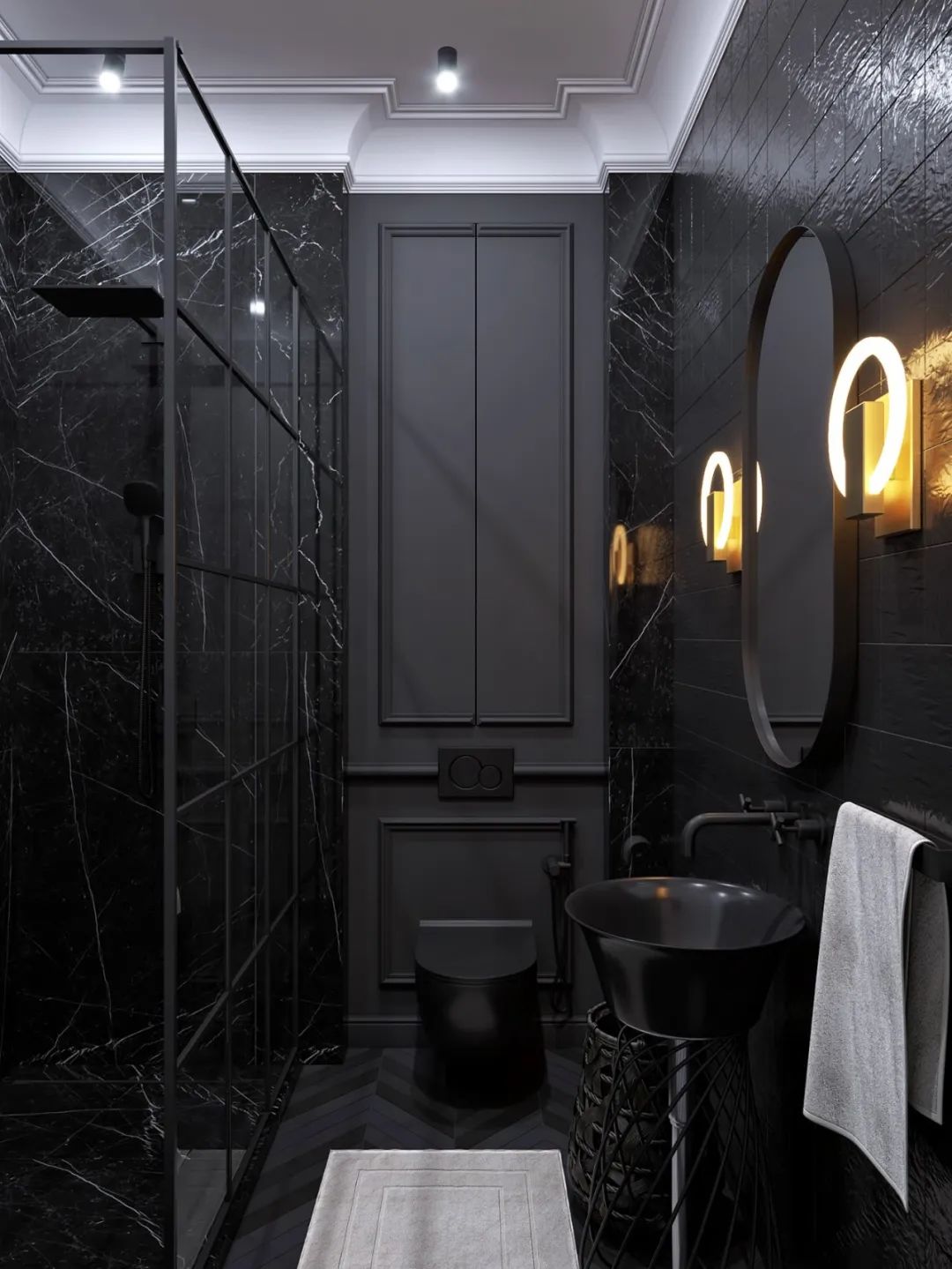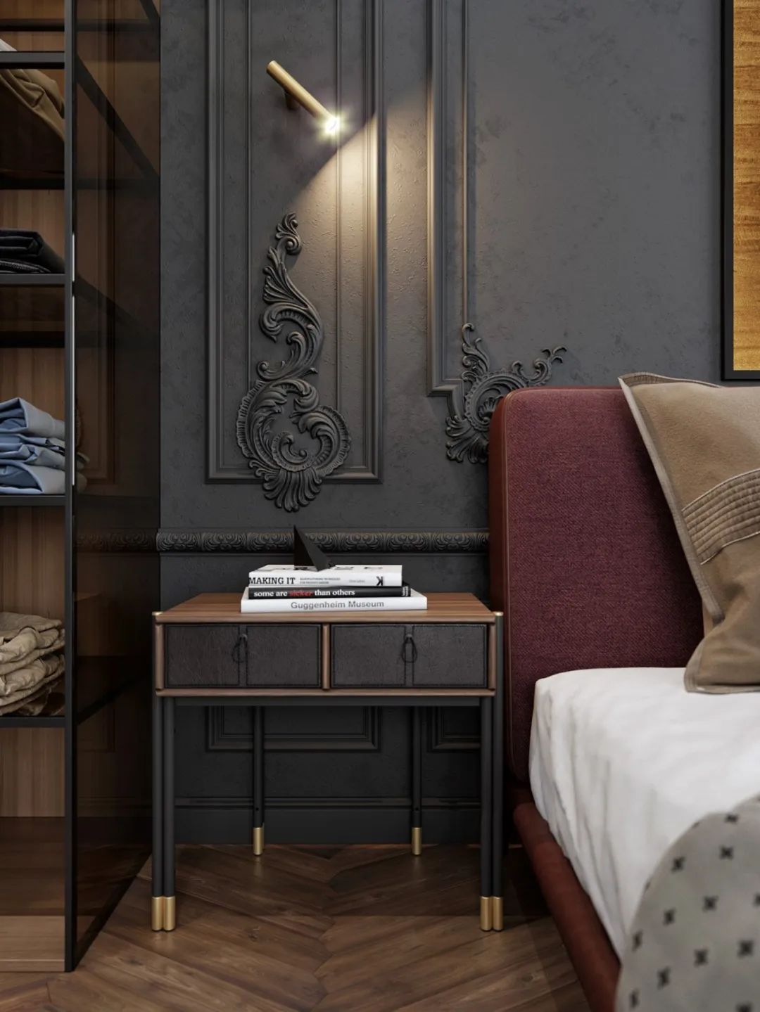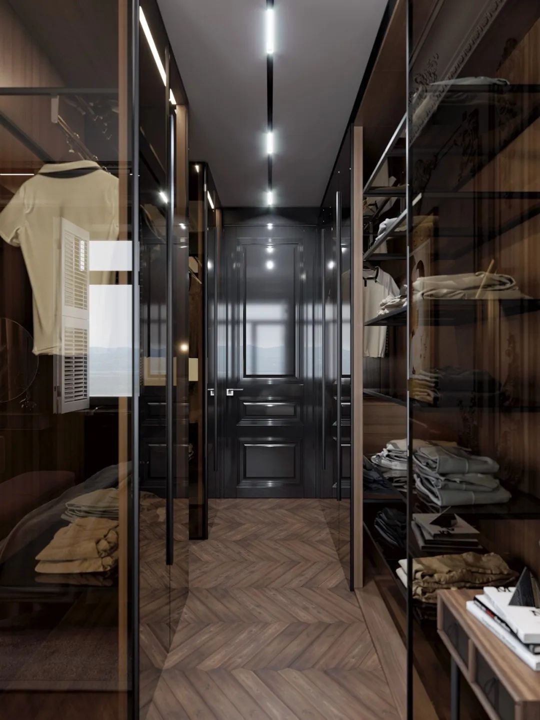 卧室的侧面是两排黑色玻璃衣橱,右手边的衣柜里藏有黑色的洗浴间。给主人营造出一个绝对隐秘的私人空间。