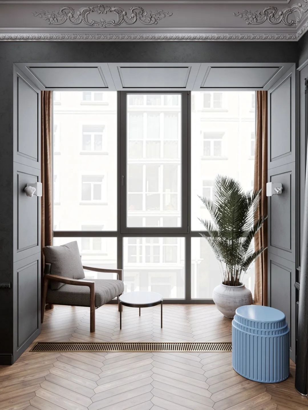 卧室阳台大大的落地窗前摆放着绿植、单椅,闲暇之余在此品尝美酒,观看美景,多么惬意呀!