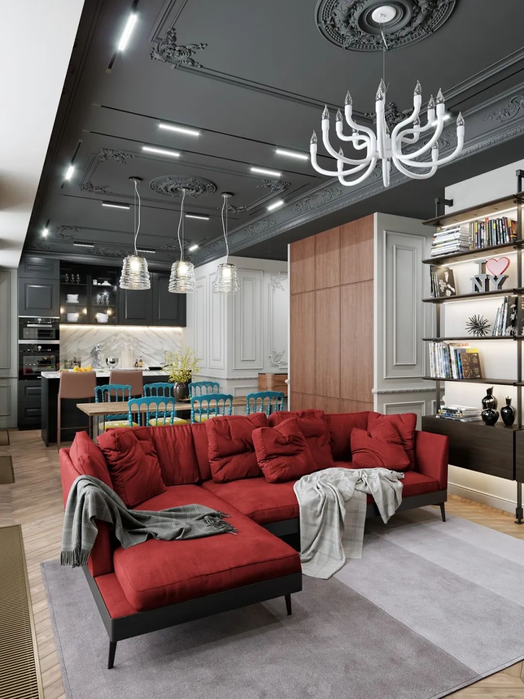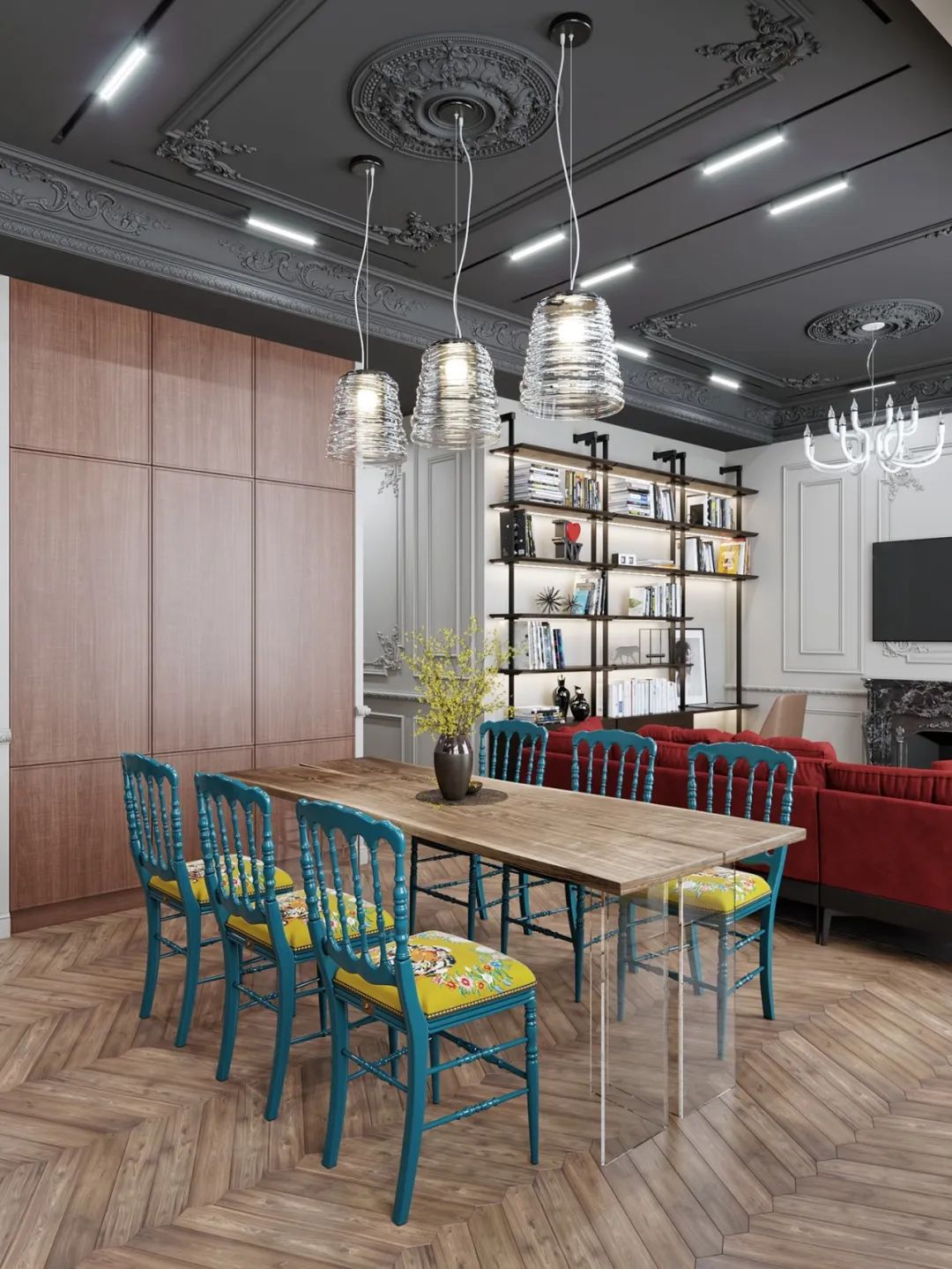于是在本案的设计中,公共区域以木色地板和黑色天花板铺陈,搭配了红色、蓝色、黄绿色的复古家具和雕花石膏线,营造出中世纪的梦幻味道。
