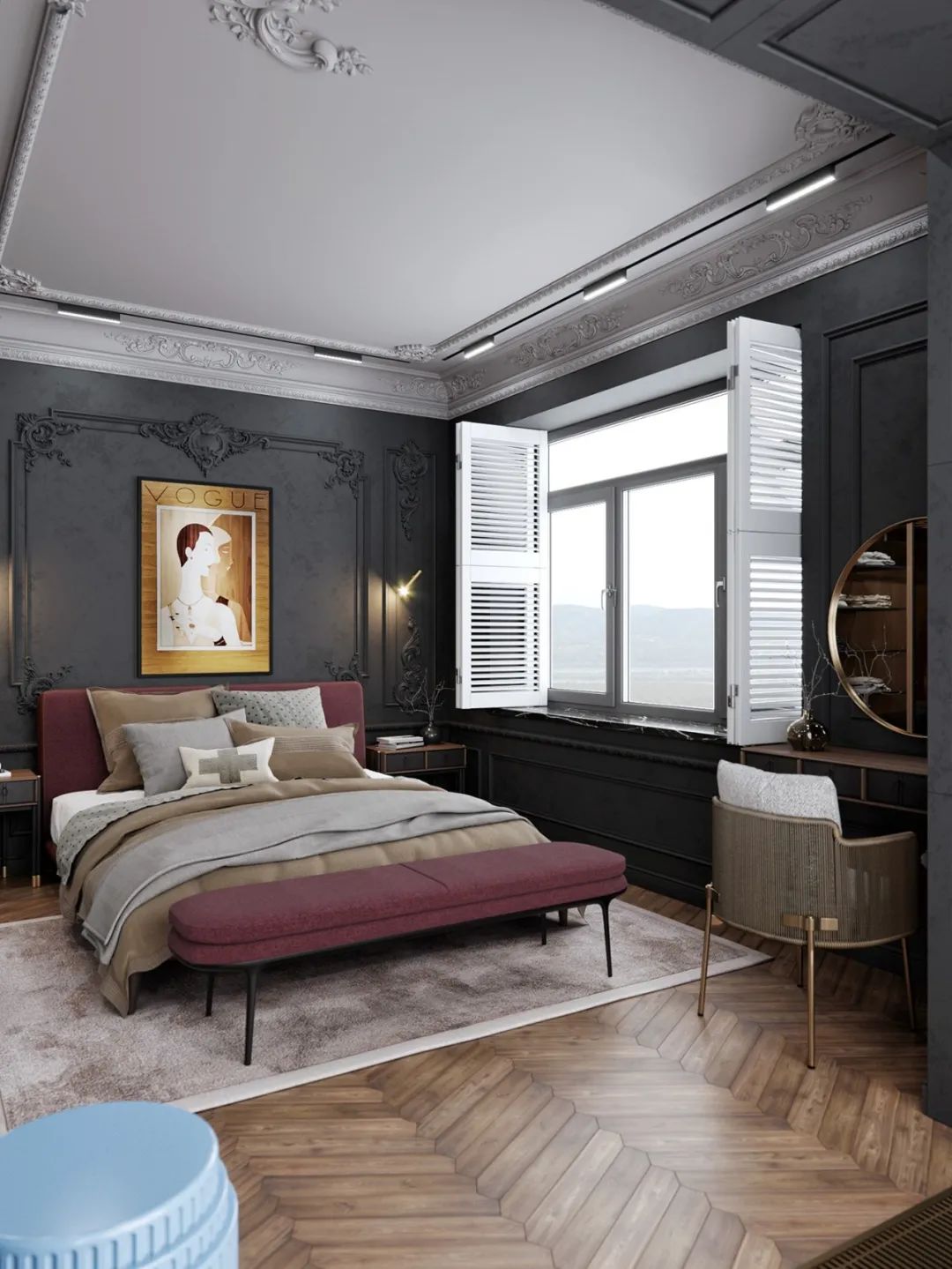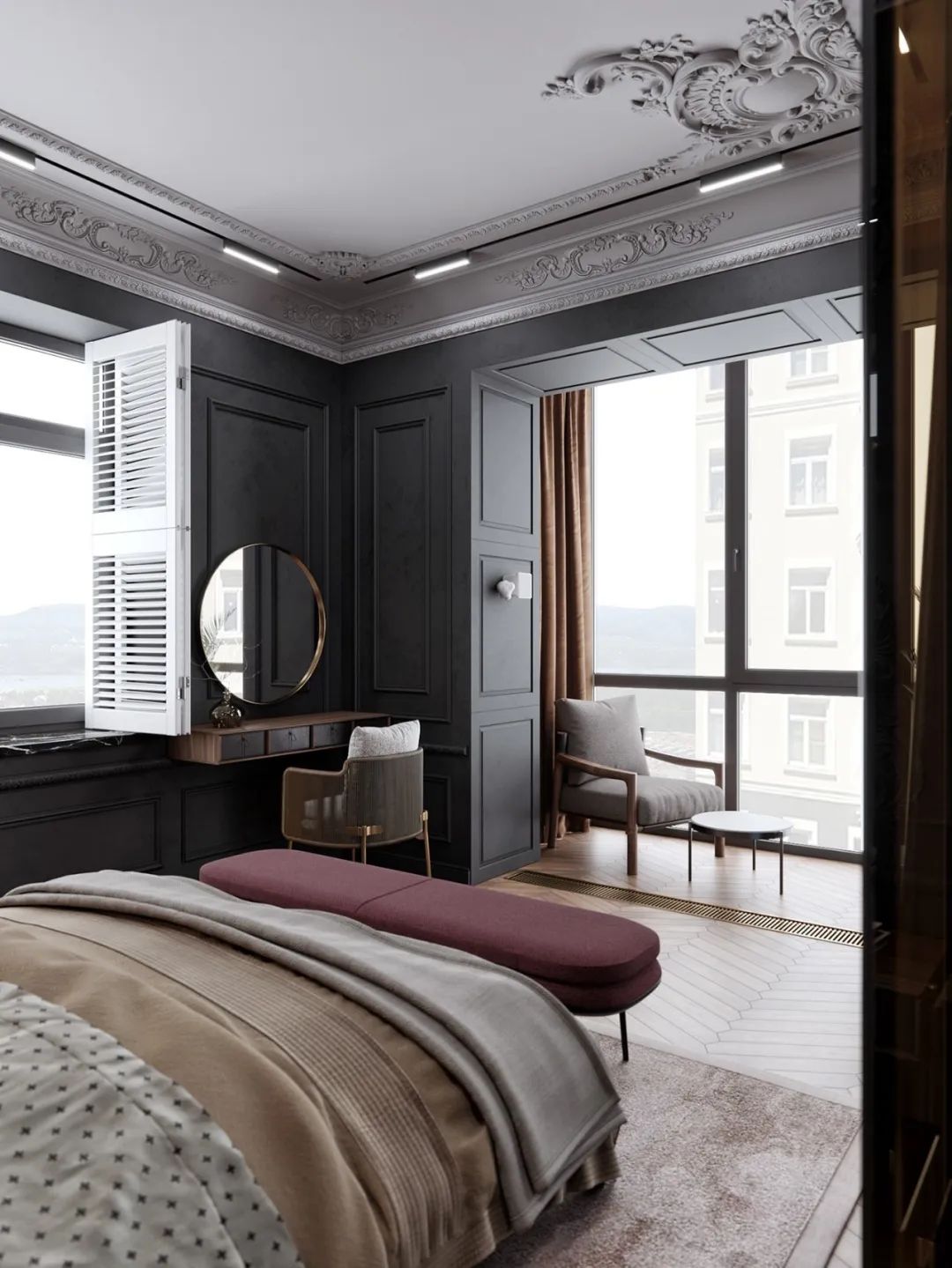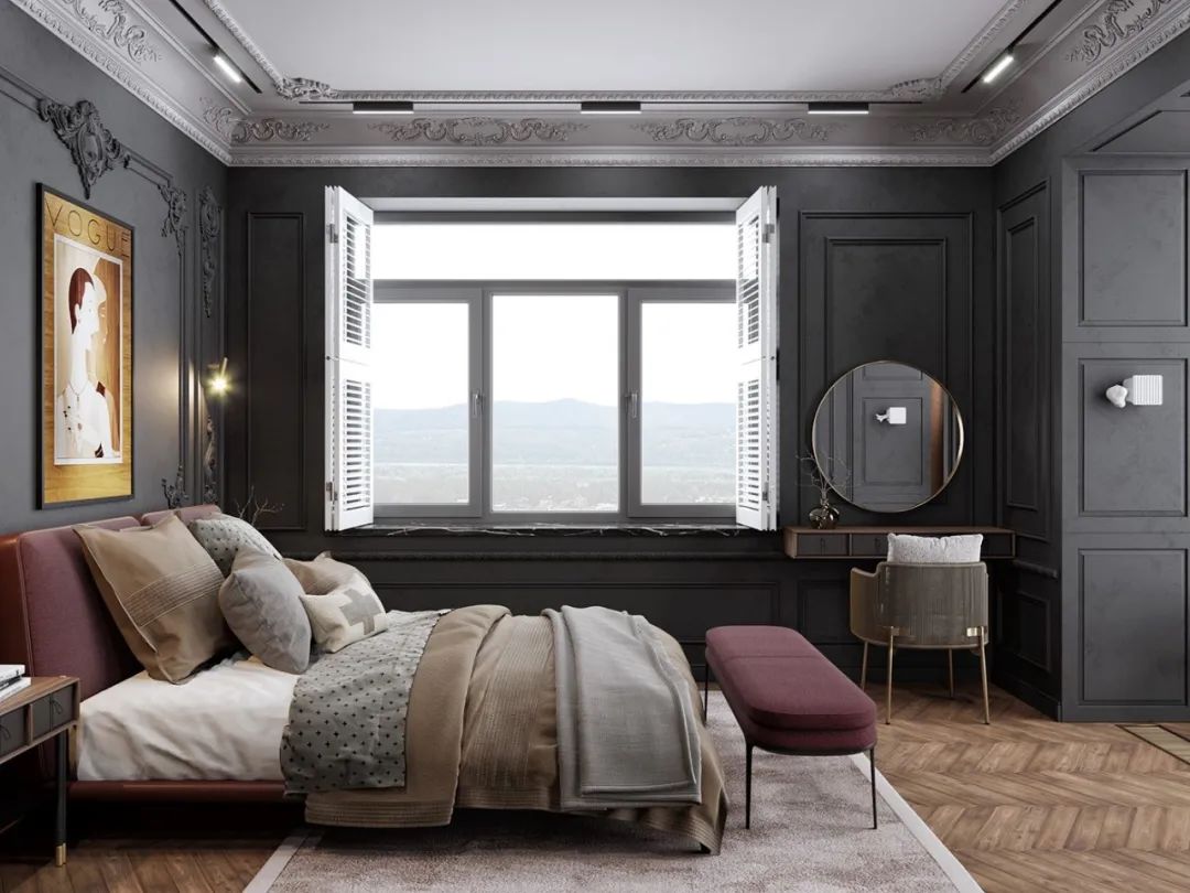 卧室墙面依旧采用黑色为主色调,搭配怪诞的装饰画和暖粉色的床,使空间显得更富韵味。小窗台也别具个性,白色的折叠百叶窗,像是一幅意境幽远的画框,将窗外的美景尽收眼底。