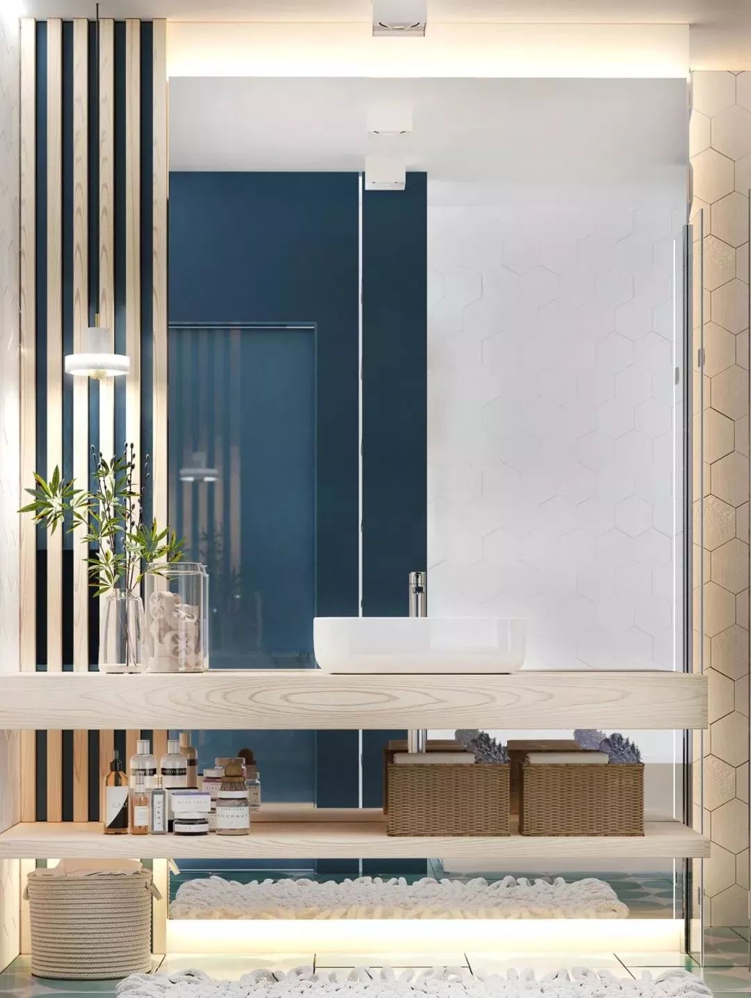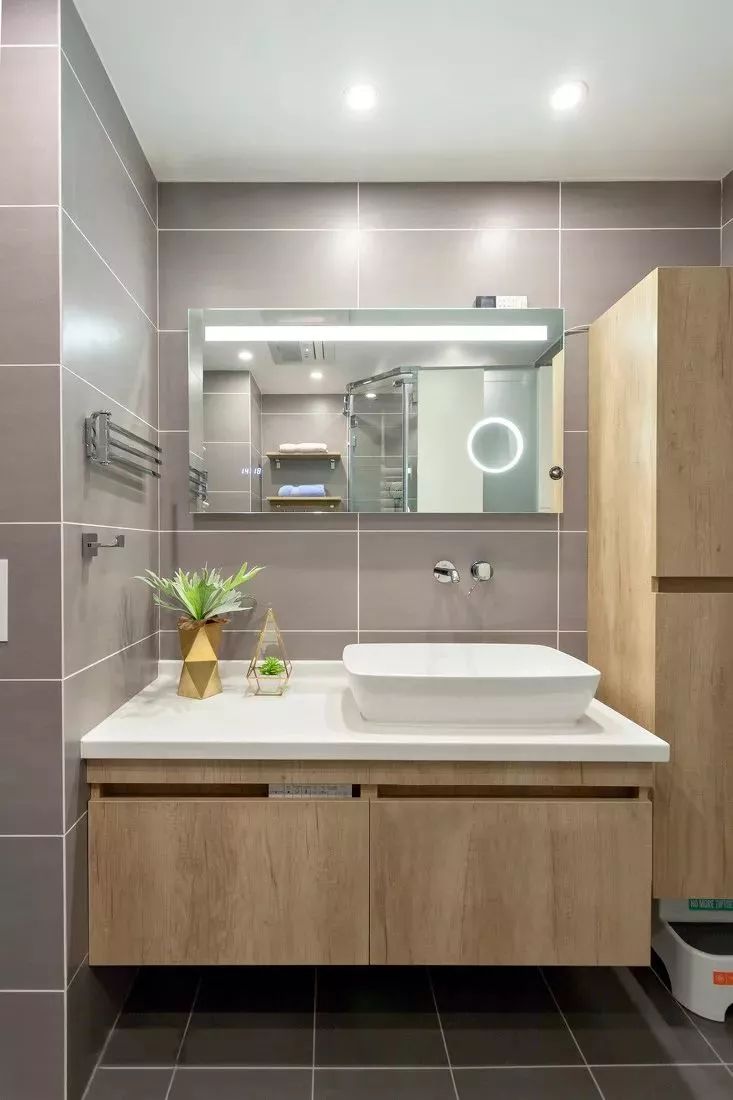 针对卫生间采光不足的问题,其实也有很多的小妙招。比如:除了顶面的主灯之外,你也可以加入其它的辅助灯光。
