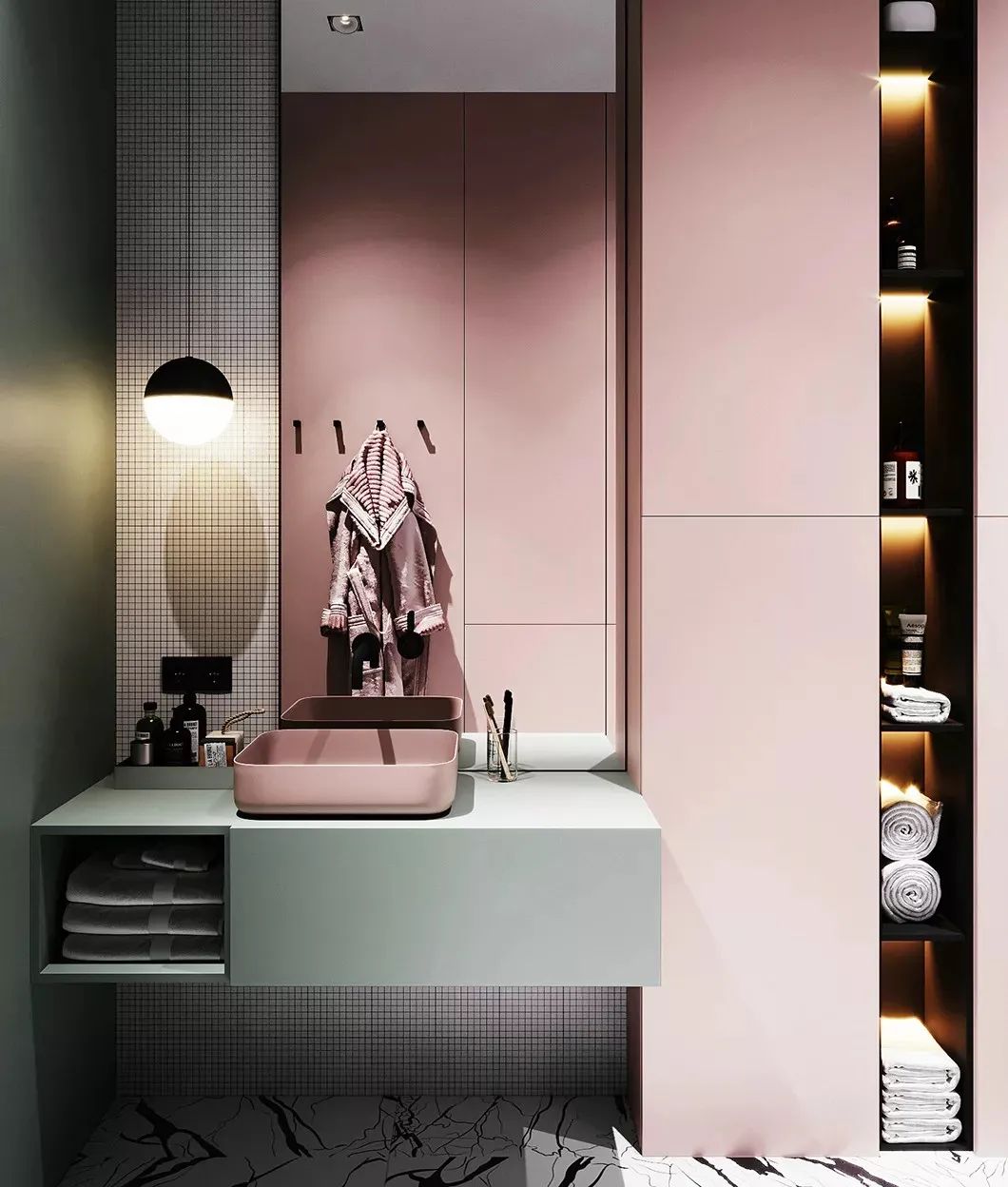 卫生间的角落一般是下水道的管道,普通做法都是把它们包起来,但是也有弊端,包管又会让原本规整的墙面出现凹凸,这样就相对没有那么美观。这时候做成收纳空间再好不过。 ● 夹缝做万能洞