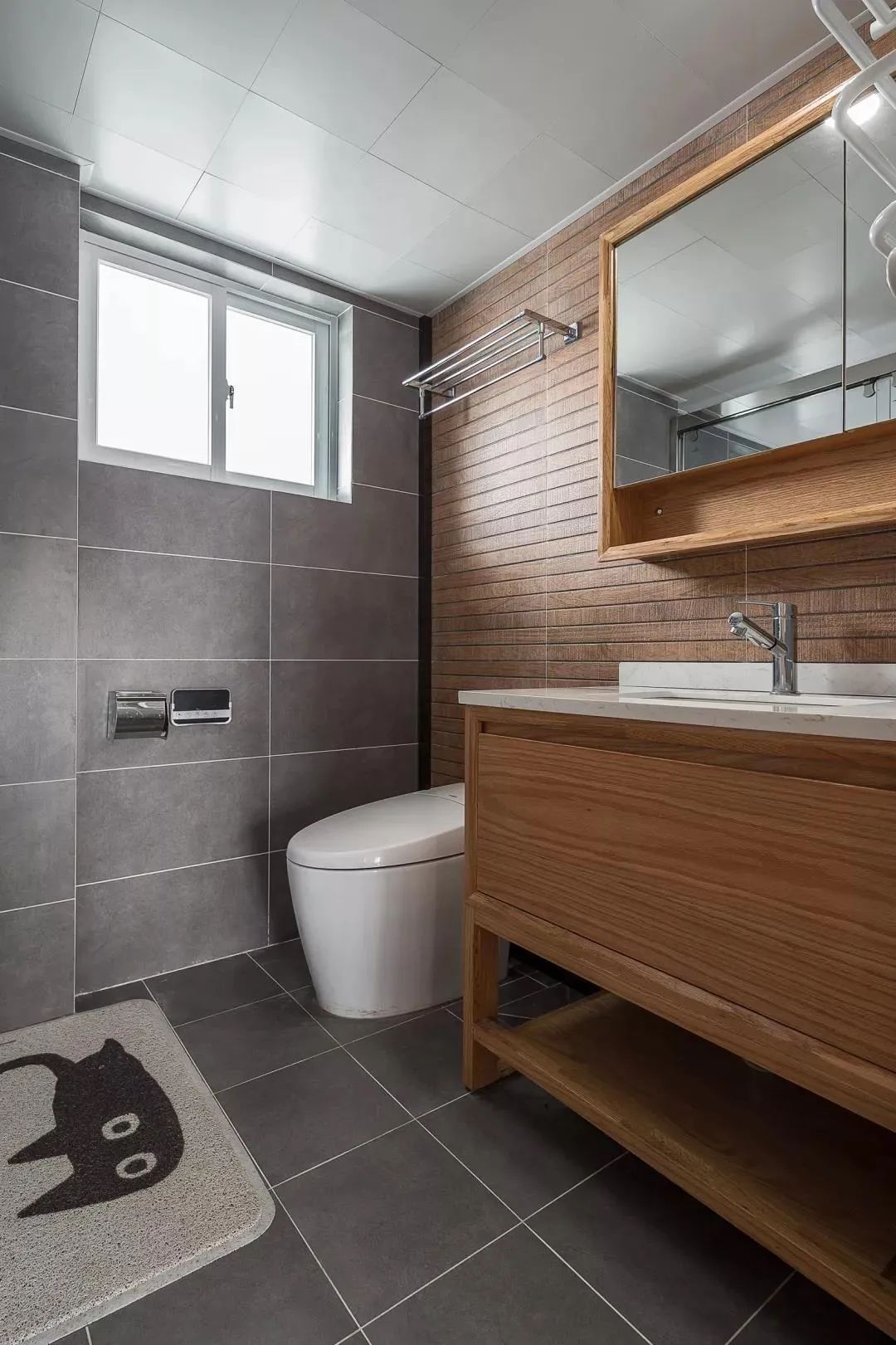当然,如果卫生间空间比较大,也可以在靠窗的马桶旁留出一小块区域放置猫砂盆。