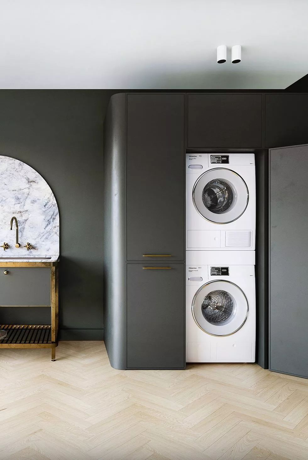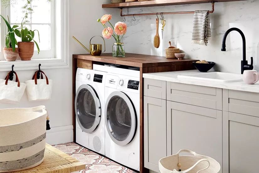 当空间面积较小时,利用垂直空间是关键。它们的深度一般为30英寸,非常适合较小的户型,同时利用搁物架收纳洗衣用品,简单而实用。