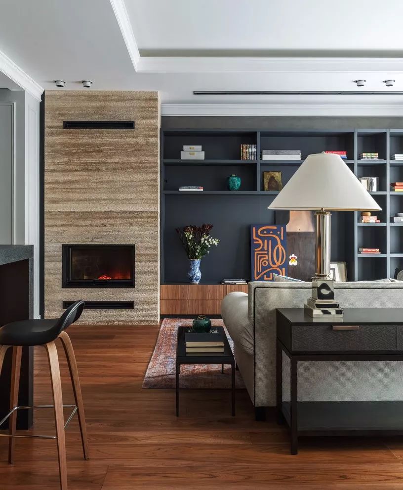 整面的书架彰显了主人对阅读狂热的爱,壁炉和实木地板则增添了居住空间的温馨。软装搭配上,整体空间是凸显高端的藏青色为主的,加以石材、金属玻璃等凸显品质元素,但为了避免这种“高端”感带来的冰冷,利用光线、木地板和鲜花软装去增加居住环境的“人情味”。