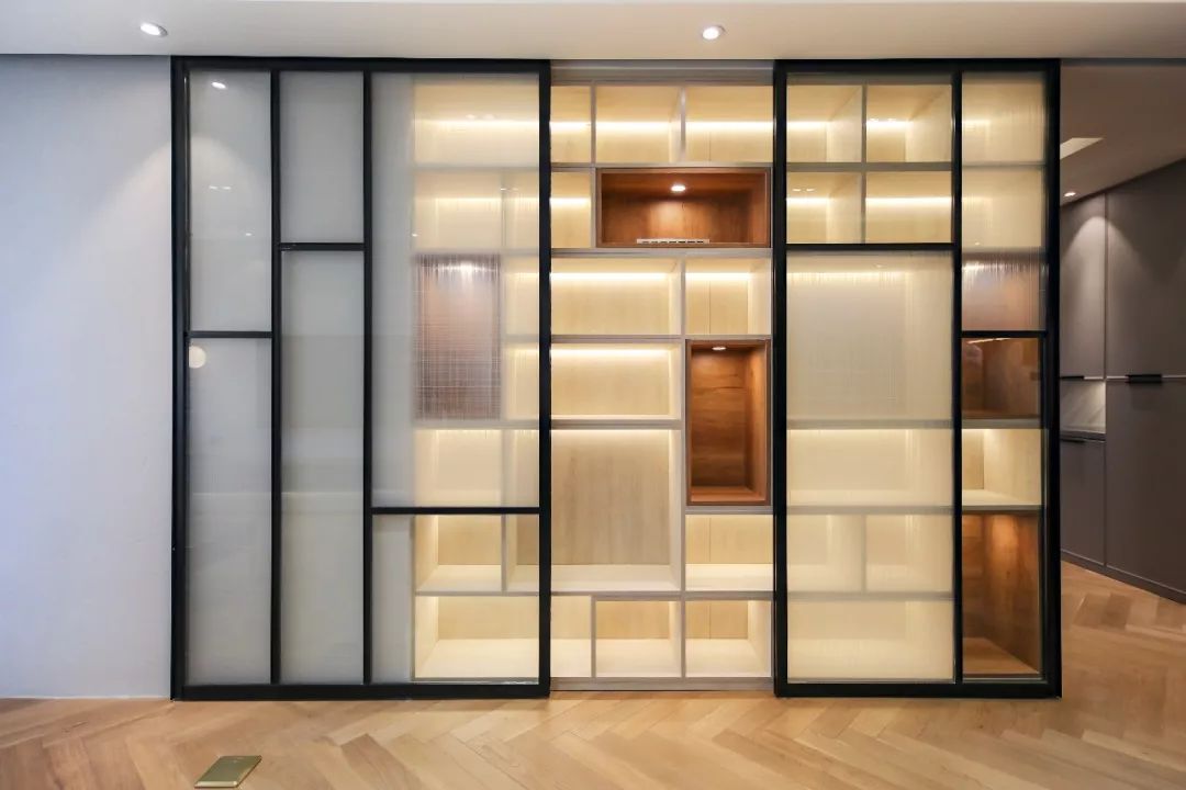 空间的隔断也舍弃了原来的柜体、墙体等形式,以更加通透性的玻璃隔断为主。