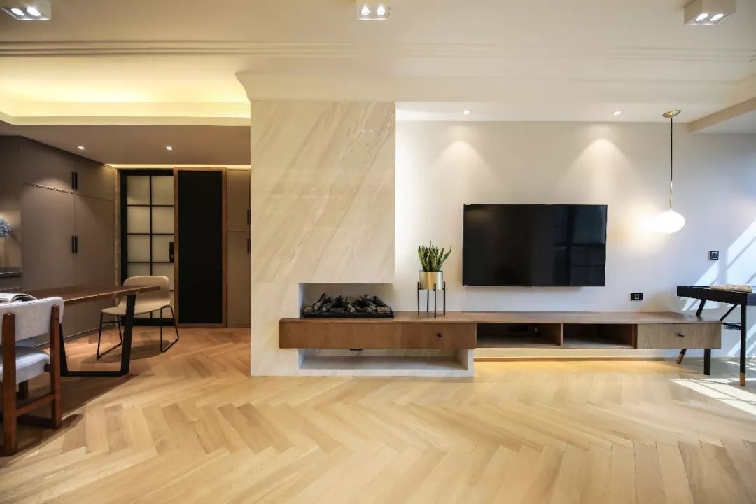 客餐厅与活动区相连,各区域功能叠加使用使动线更加灵活,电视墙与电视柜一体设计,美观、收纳、节约空间、易清洁的优点都占了。