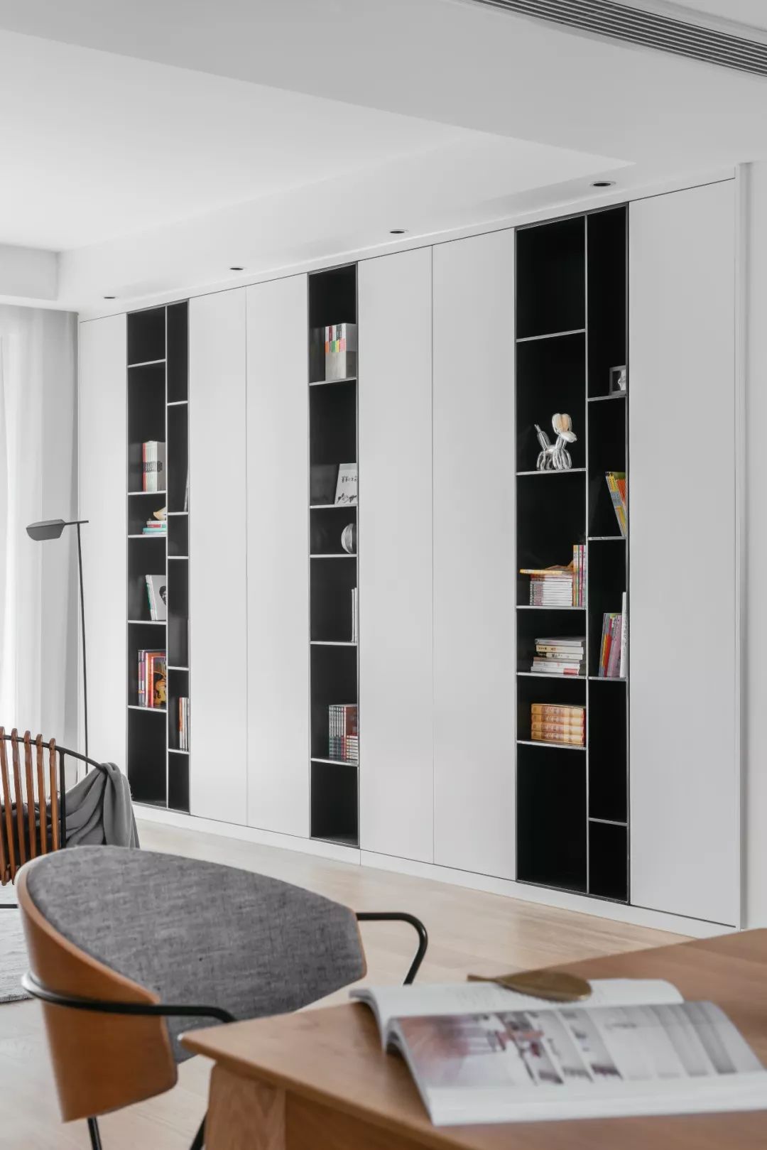 客厅里没有放电视,但依然设置了电视背景墙,沿着墙面打造顶天立地的大柜子,黑白搭配干净利落,黑色部分是不锈钢喷漆,整个柜子的收纳有藏有露,不会显得呆板无聊,也便于收纳整理。