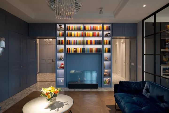 大面积蓝色的柜体和背景墙面,让整个客厅将“高端”贯彻得很彻底,这个空间的主题是书和壁炉,这些也都是通过浅藏青色的柜子来实现的,收纳柜的每个格子里都有灯带的使用,一下把书墙作为空间的亮点烘托出来。