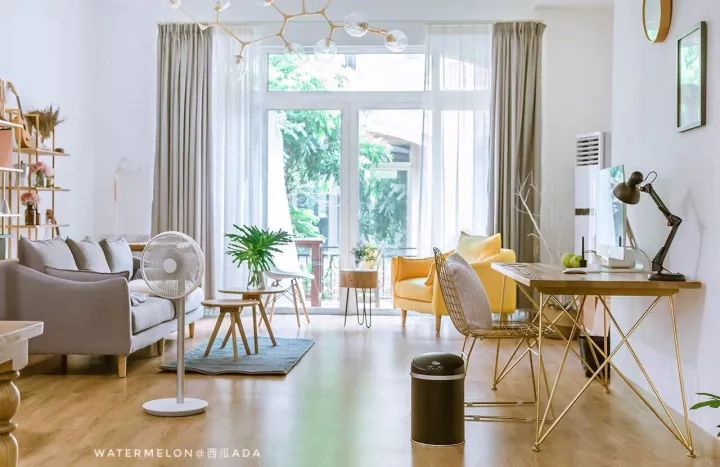 西瓜的客厅功能十分丰富,沙发阅读休息区+阳光休闲区+工作区+沙发背后阅读区,整个空间没有复杂的装饰,主色也只有有白、灰、木色、金色,加上满室的阳光,特别耐看。