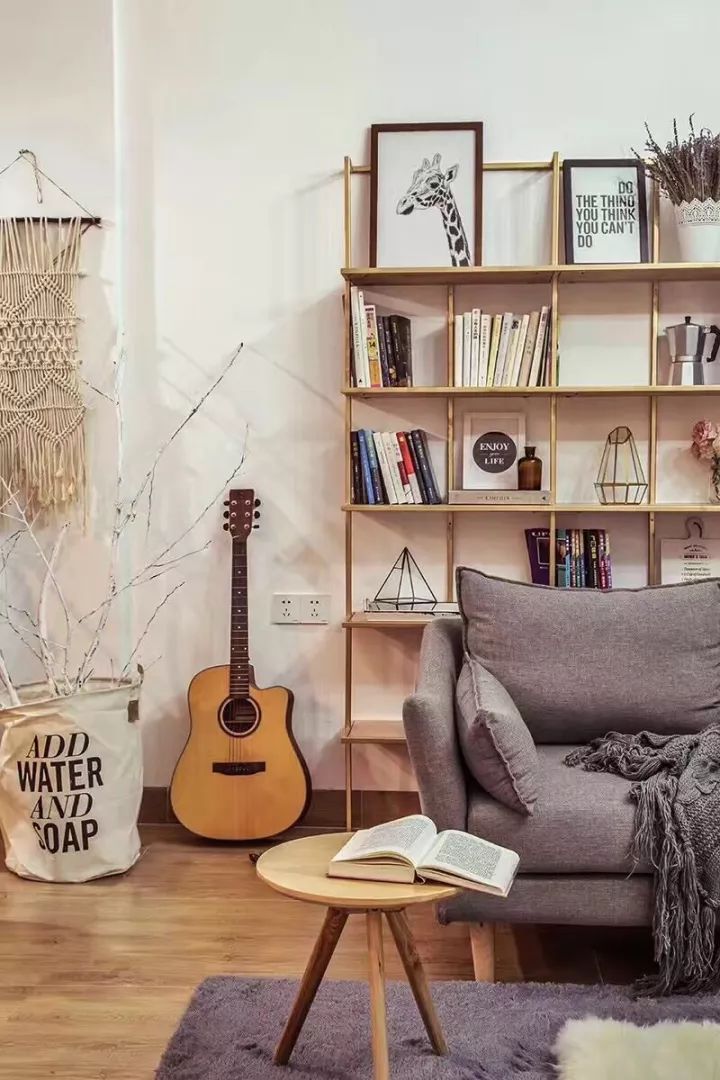 客厅没有什么大件昂贵的家具,没有电视机,更没有传统电视墙,除了要为拍摄留白,西瓜还不希望女儿看太多电视。为了让这个空间不会过于简单,西瓜摆放了自己喜欢的小物件修饰。