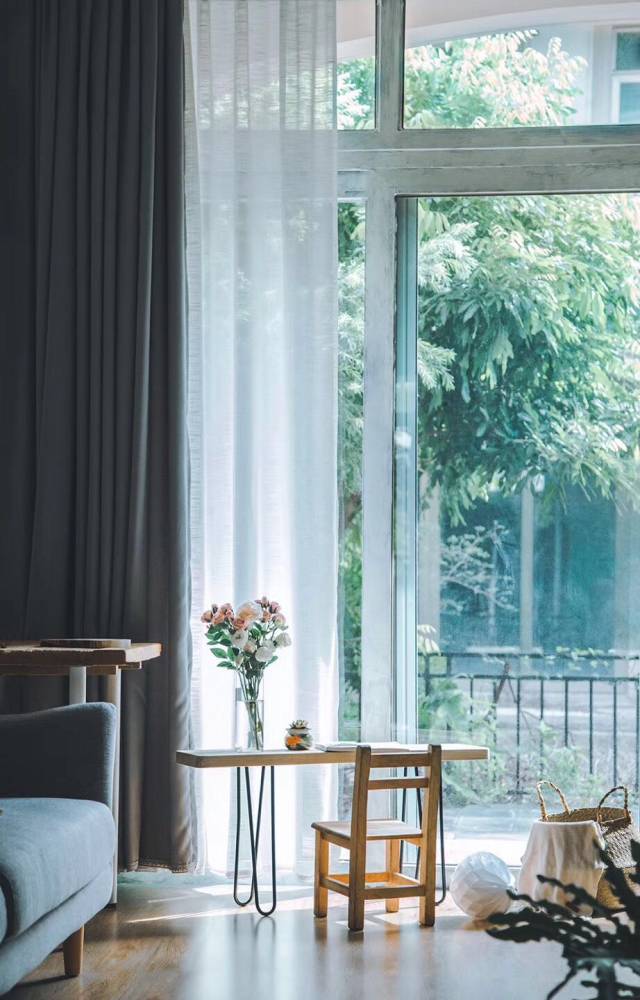 客厅有一整面墙的大窗户,这也是兰奕当时对这套房子一见钟情的原因,想象着每天阳光充满家的温馨画面,因为希望在窗边放置一些绿植,所以制作了木质窗台,榉木材质,自己买了柚木色的木蜡油刷涂。