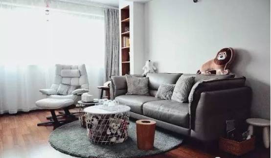 客厅抛去了万年电视墙,改成一个小型休闲娱乐空间,小圆桌茶几代替了沉重庞大的大茶几,显得轻便好用,沙发选用棉布制的灰色系,略显高级体量也不大。