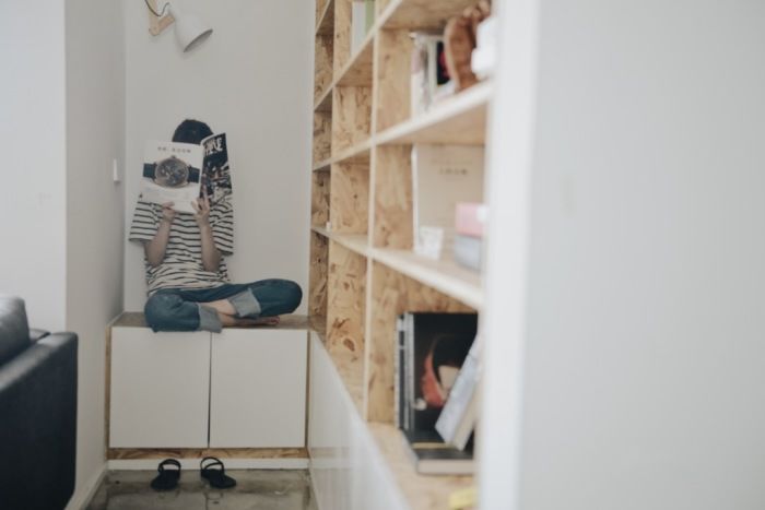 靠近窗子的位置,西瓜还用条凳,给女儿做了张小桌子,大人在沙发上看书的时候,女儿也可以坐在这里看书写字或者画画。