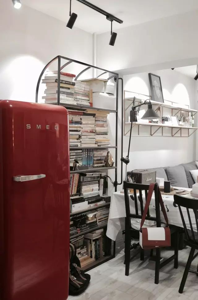 沙发背后的金属+实木置物架上,满满的都是两个人爱看的书和摄影用的小物件,收纳整齐又便于展示,同时金属+实木置物架也没有纯实木大书柜的压迫感。