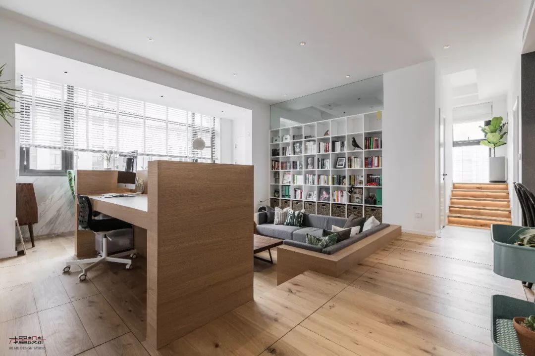 沙发背后的不能打掉的承重墙,顺势做了一个阅读区,阅读区的低位柜体,也是设计的一个亮点,柜子内部空间满足了收纳功能,同时又满足了座椅的需求,舒适度四颗星。