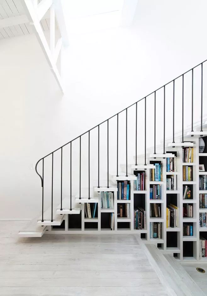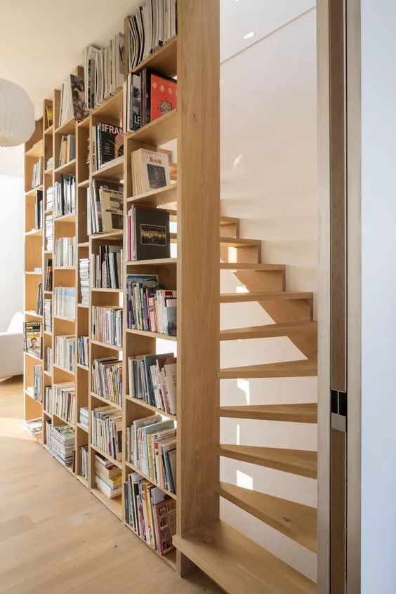 书墙可选用内嵌式,更加节省空间。如果户型较小,可以考虑砸掉非承重墙,用书架作为隔断。