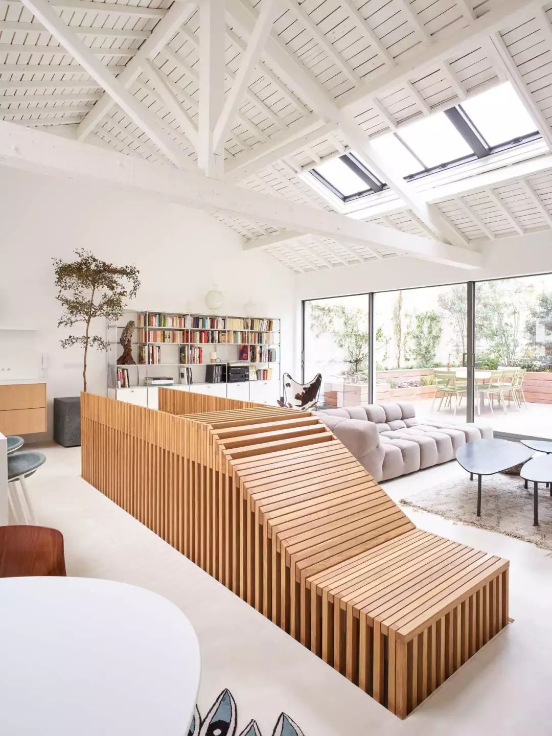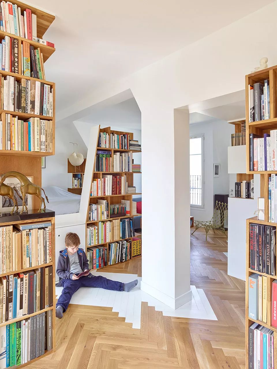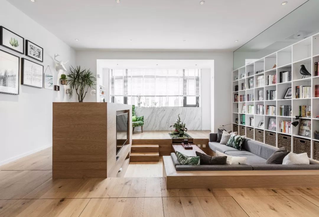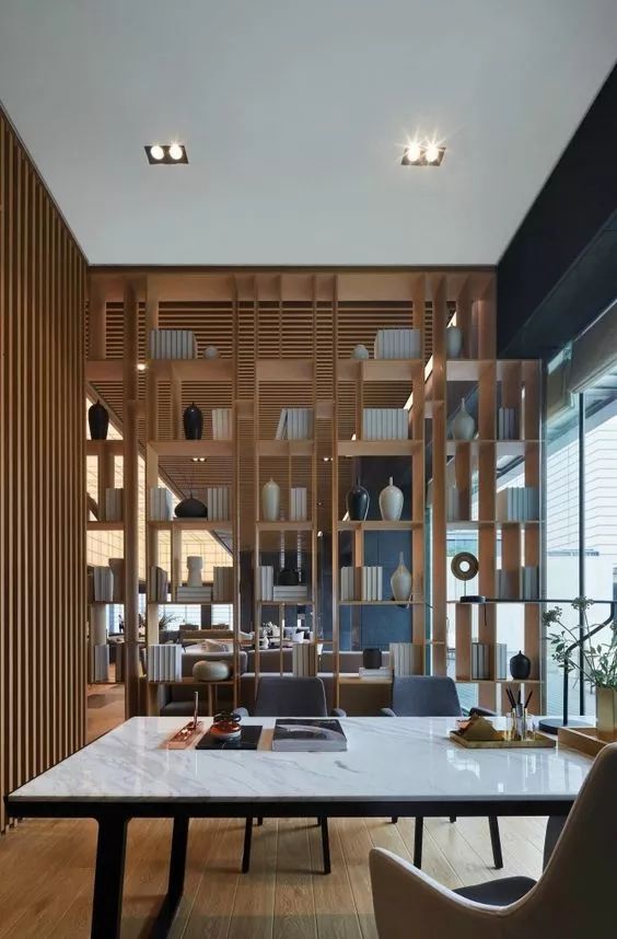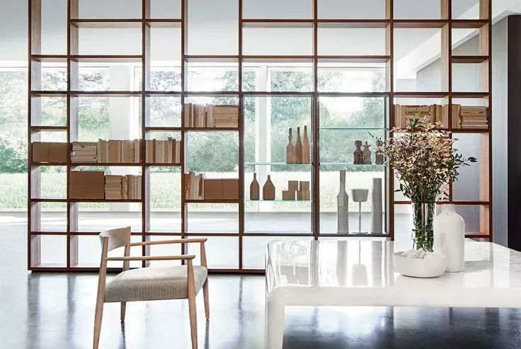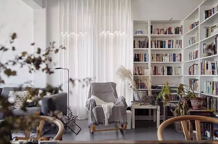 除了在原有功能区内增加书架,我们还可以利用书架创造出一个独立的小空间。利用书架作为隔断就是一个巧妙地思路,既能保留采光,还能增加收纳空间,让居住空间更有层次感。