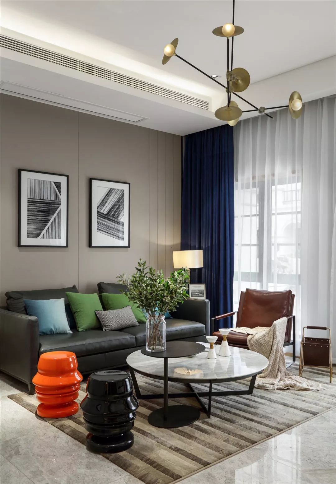深色皮沙发凸显尊贵,亮色抱枕、橙色坐墩的加入打破内敛的沉静氛围,令整个空间优雅又不失灵动。古铜色的小号灯奏响空间的美妙序曲。