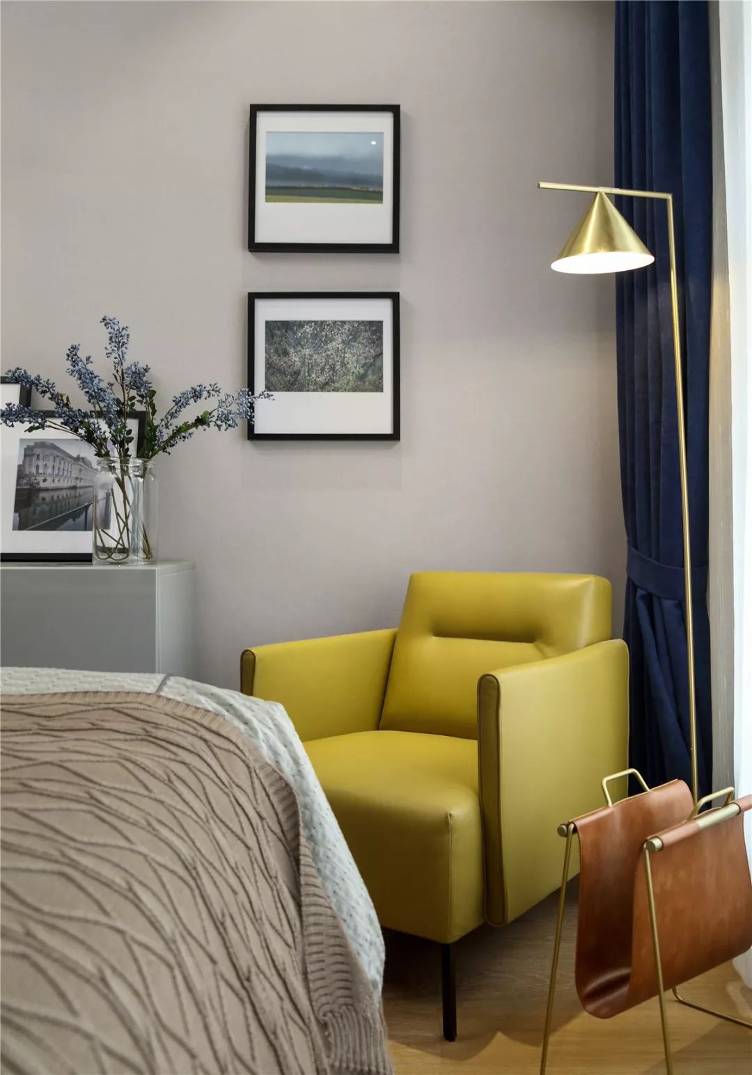 浅色床品与金属灯具的搭配,芥末黄与宝石蓝的交织,打造出空间优雅的气质。墙上的风景画与窗外的美景遥相呼应,坐在这里喝杯咖啡,翻翻杂志,惬意享受生活的闲适。