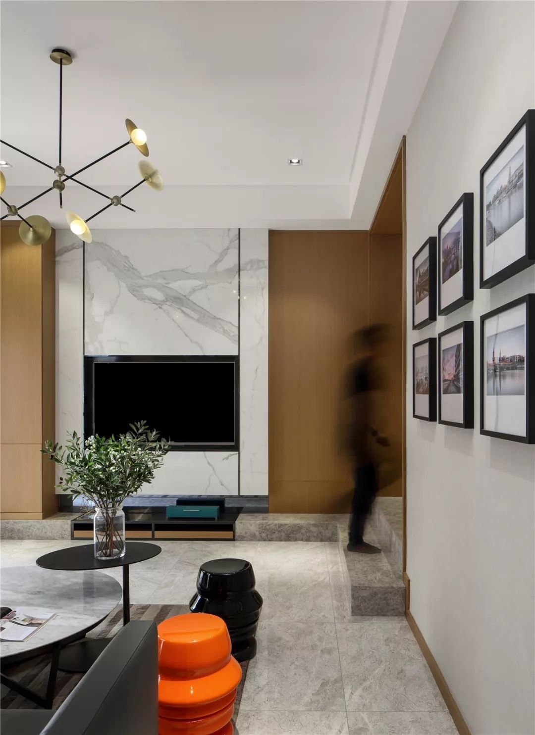 意大利IMOLA瓷砖铺贴效果电视背景墙采用整块天然大理石,石材的纹理呈现出如流水般的动态感,大理石内嵌黑钢线条,在彼此的碰撞中演绎着低调的奢华。电视机左侧嵌入整排储物柜,具备强大的收纳功能同时又视觉统一。