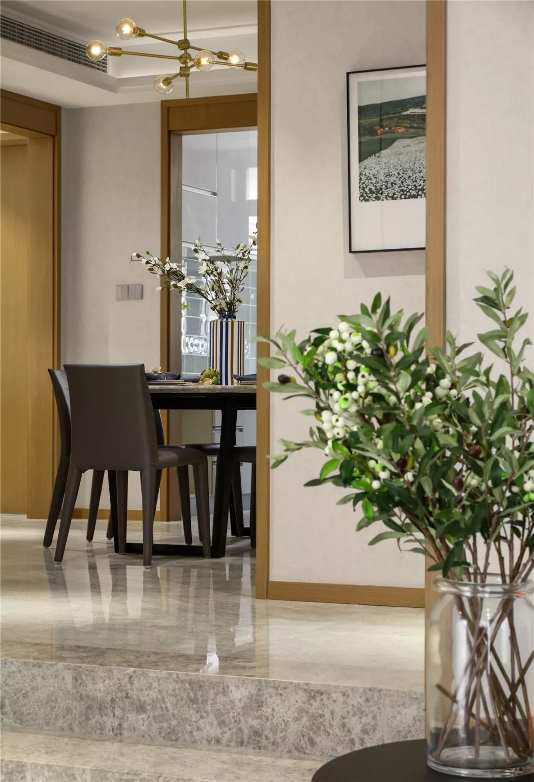 意大利IMOLA瓷砖铺贴效果整个餐厅色调运用娴熟,大理石餐桌与真皮餐椅在大气之外,多了一份清雅的格调。造型灯饰凸显吊顶空间,轻描淡写的一笔大大减弱了视觉上的沉闷与压抑。