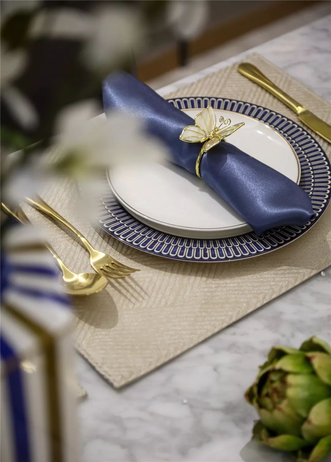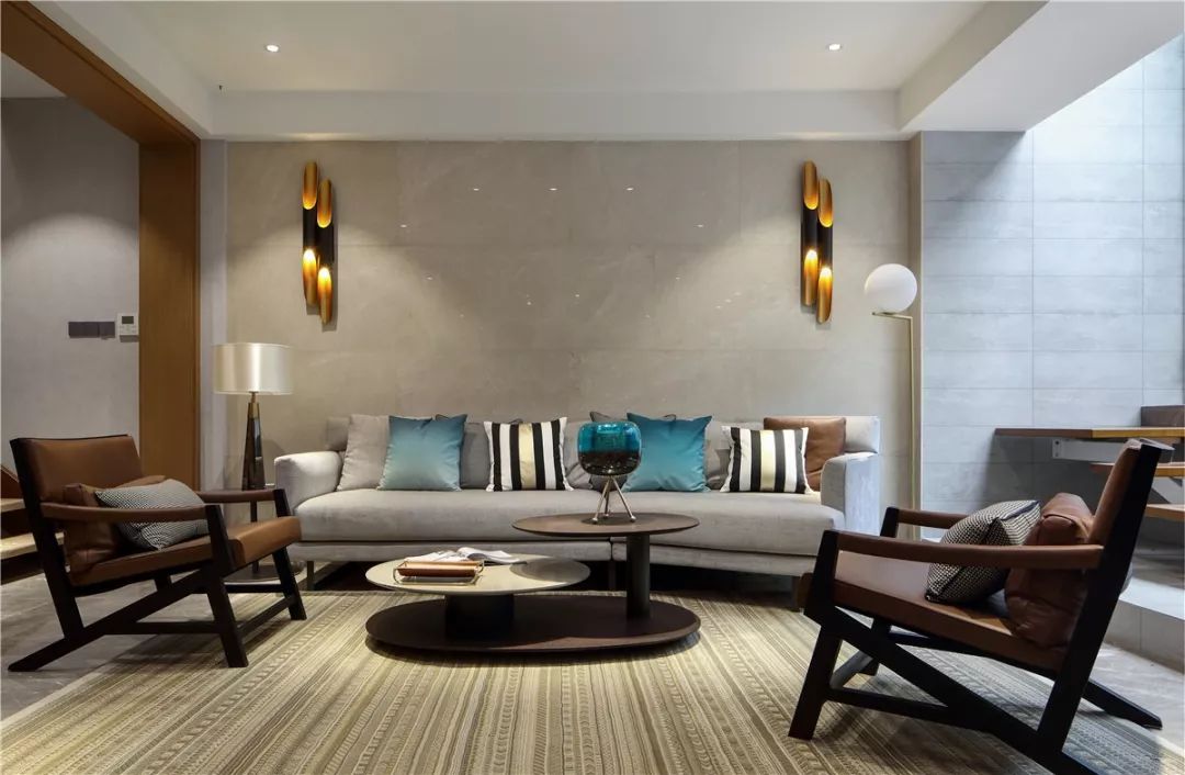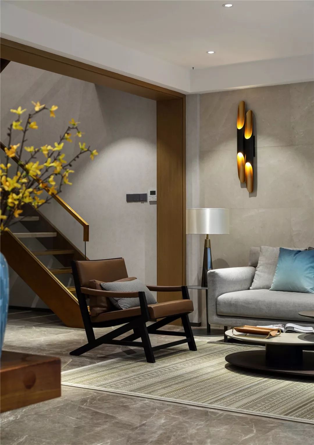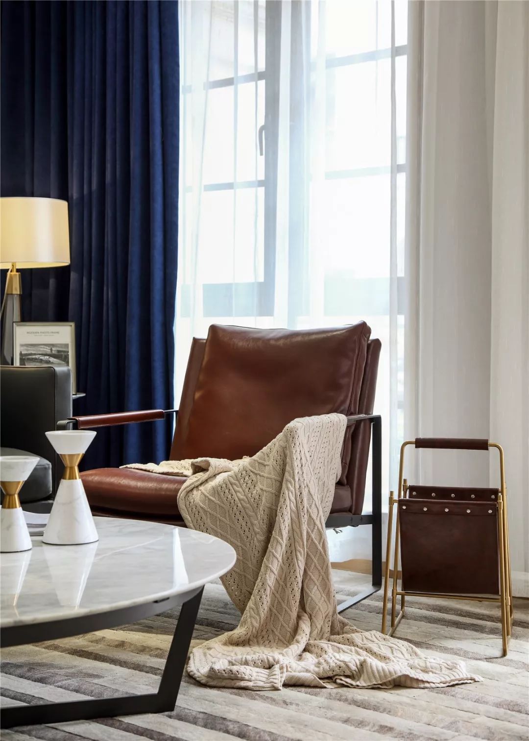 在负一层会客厅的设计中,设计师将石材、皮革、金属等材质混搭,米白、卡其、宝石蓝色调加以点缀,打造出沉稳、静谧的空间氛围。