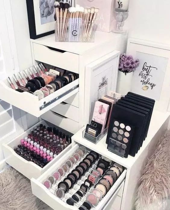 其实最好用的收纳物品就是抽屉,例如美国真人秀明星兼化妆品品牌创始人Kylie,即使东西再多,但是分门别类地放好,而且是以平铺式的摆放,想用什么一目了然,非常方便,防尘能力超强。