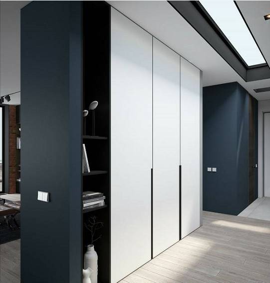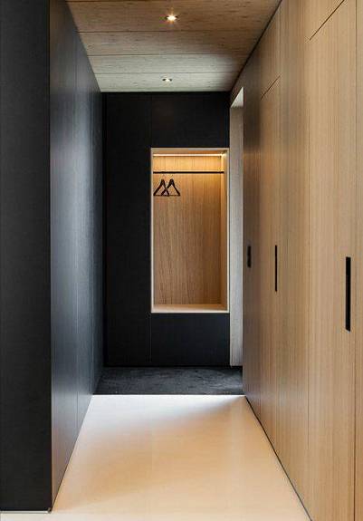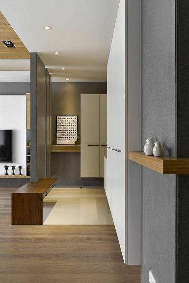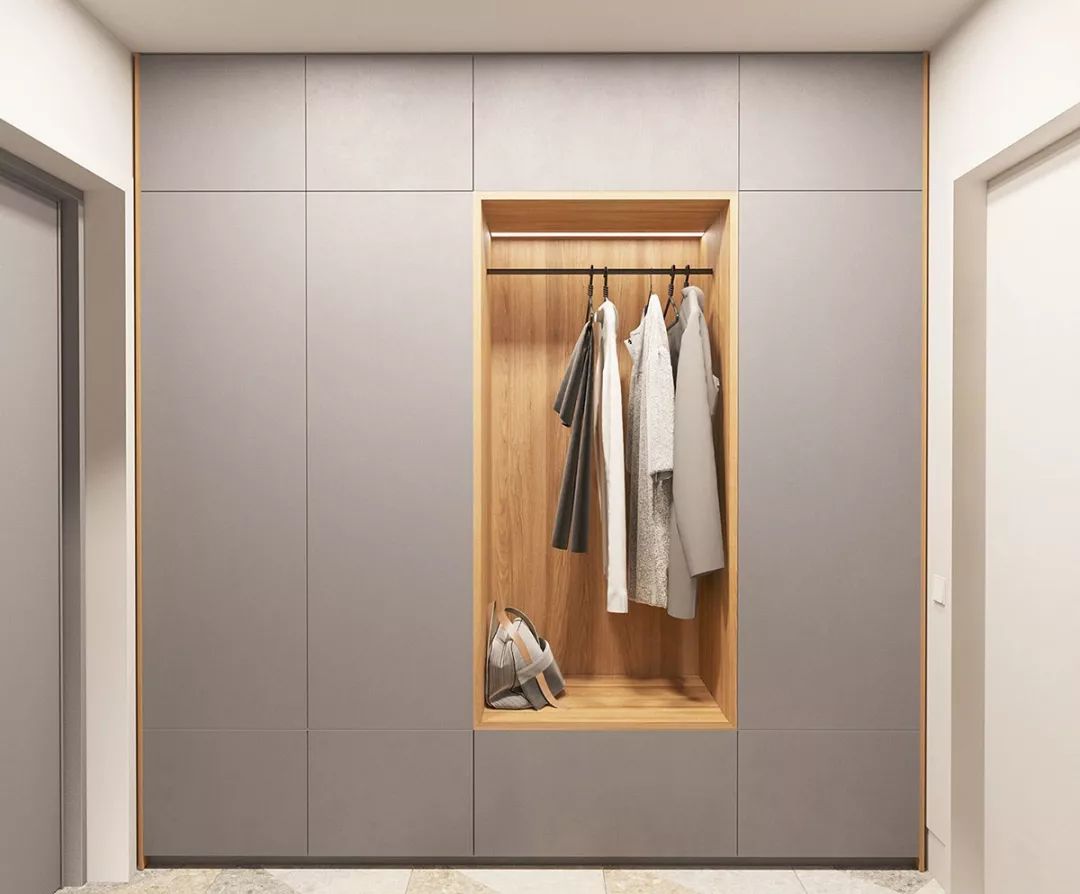 嵌入式壁柜是节省空间的利器,在设计之初,它往往和进门处的吊顶连接在一起,不仅外观看起来简约大气,而且拥有十分充足的内部收纳空间,可以将衣服、鞋帽、包包等杂物统统隐藏起来。