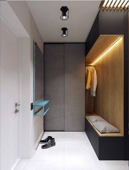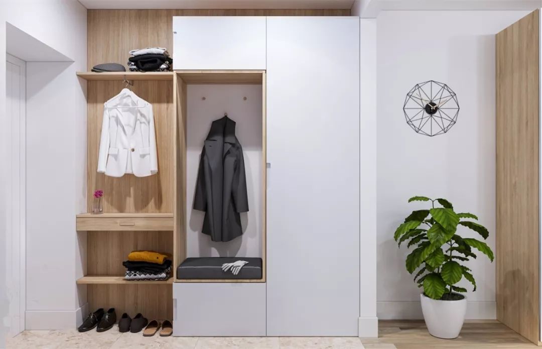 所以,充分利用进门处的转角区域,勾勒出一块专门用来悬挂衣物、脱换鞋子的地方,可以大大便利于我们的日常生活,提升整体舒适度。