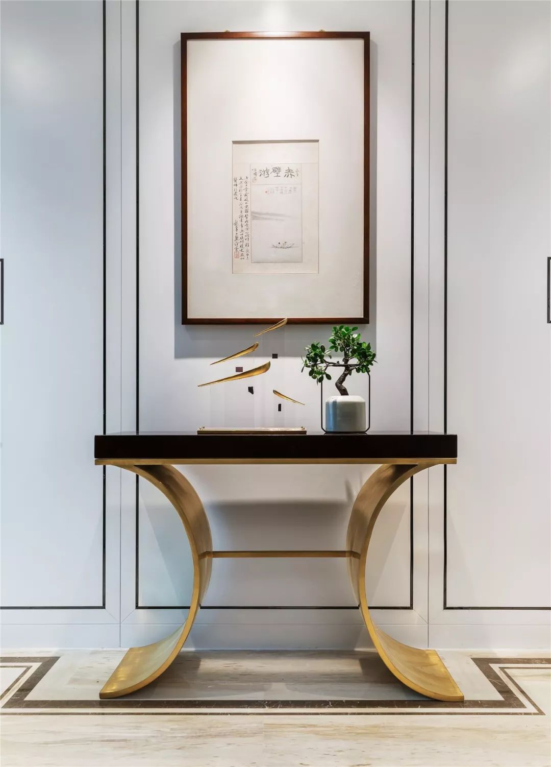 玄关桌的装饰手法有很多,你可以根据自己的品味爱好自由选择。在案几上摆放一些具有中式韵味的盆栽、饰品、装饰画等,可以让人一眼便感受到整个家的文化氛围。
