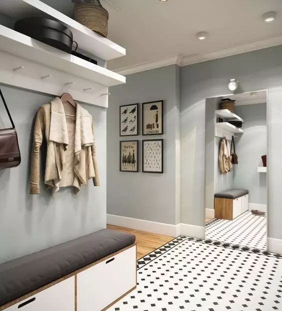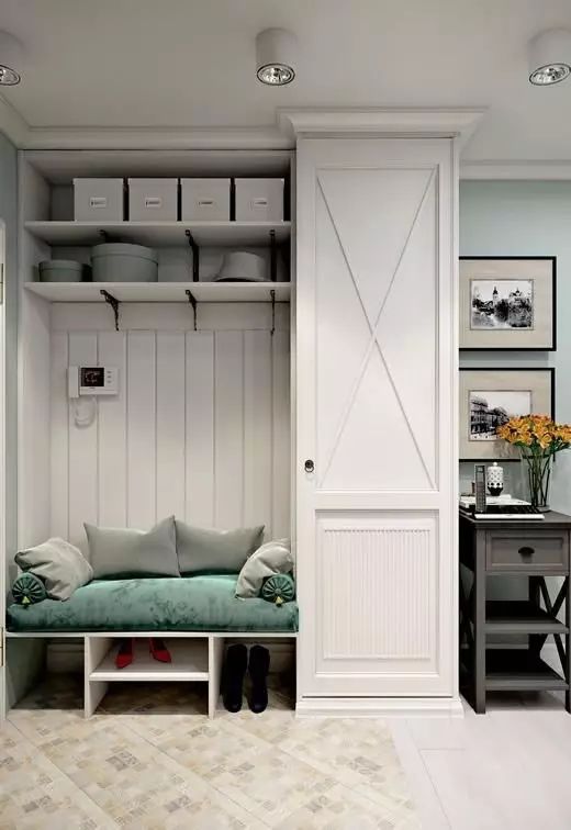 在留空区域安装几个挂钩,外套、帽子、包包等都有了合适的藏身之处,进出门的时候就再也不用跑到别的房间,轻松省事多了。