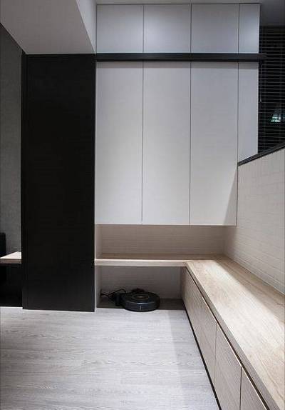 你可以设计成半开放+半封闭的形式,让换鞋凳和收纳区融为一体,还原一个干净整洁的玄关,巧妙地化解站着换鞋的尴尬;