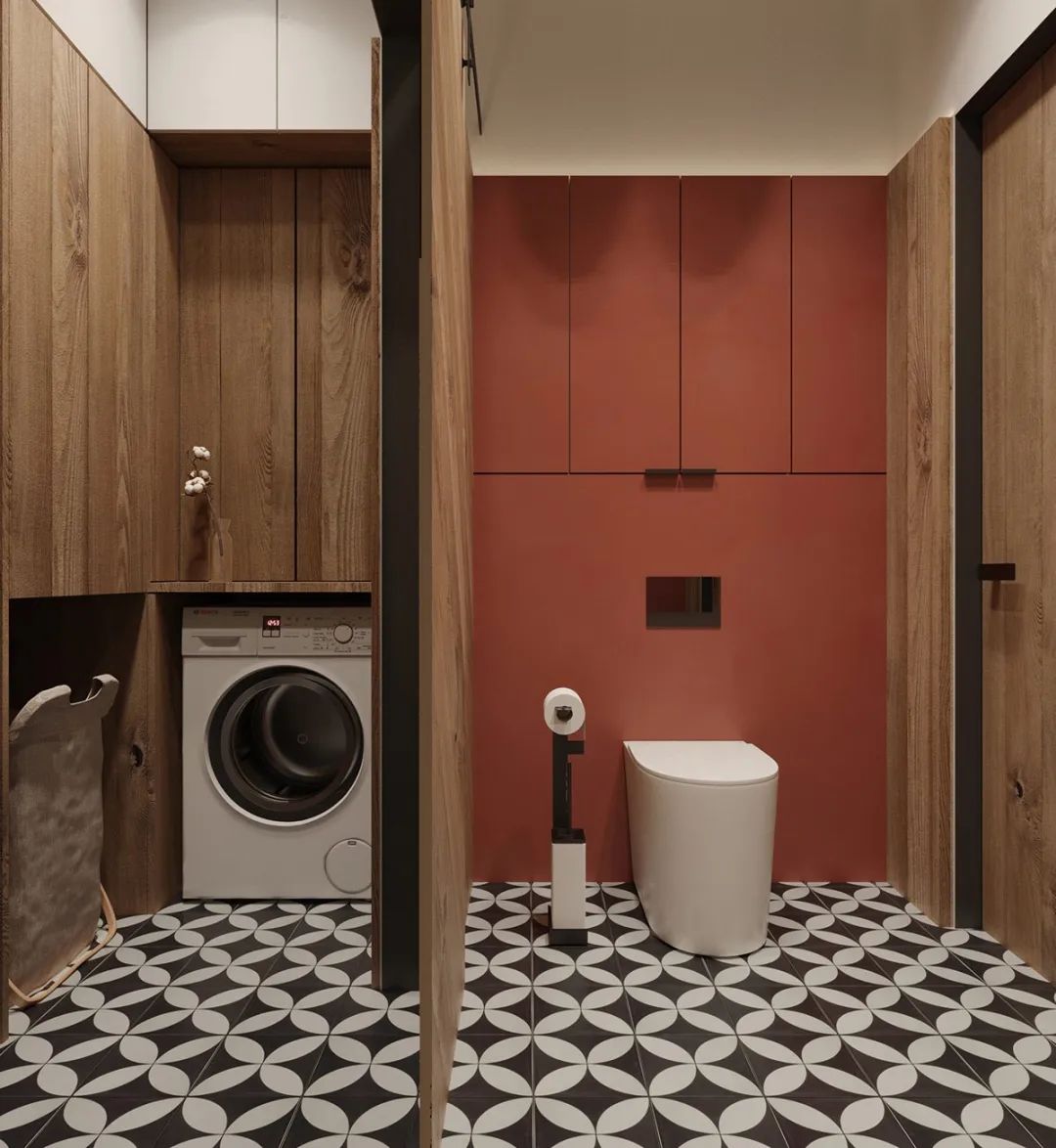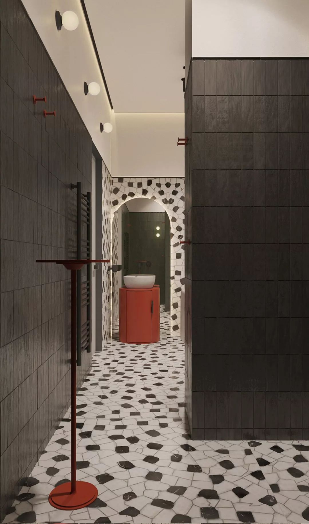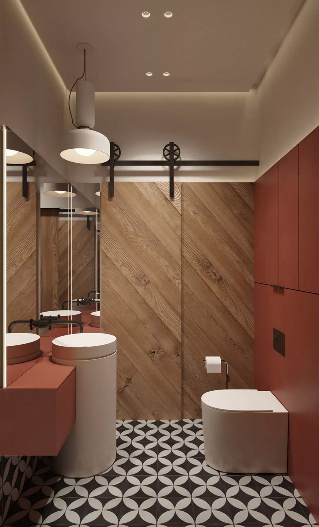 浴室主要使用了砖红色、黑色和白色设计,点睛之笔在于地面和墙面由独具个性的马赛克铺设而成,简约时尚的感觉非常符合现代审美,同时不失活泼与层次感,与众不同的超高颜值,让人在里面得到真正的放松。