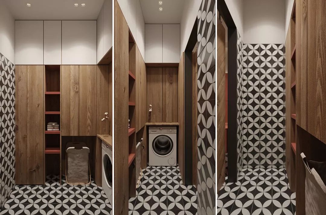 卫生间和化妆室共用一个空间,满足居住者早起与晚睡的盥洗需求。用斜切的木条做成的谷仓门,里面还隐藏着一个小型的日杂仓库,整体简洁,地面使用了和厨房同款的黑白纯色图案交织的地砖,美观性与实用性兼具,让家务变得更加轻松。