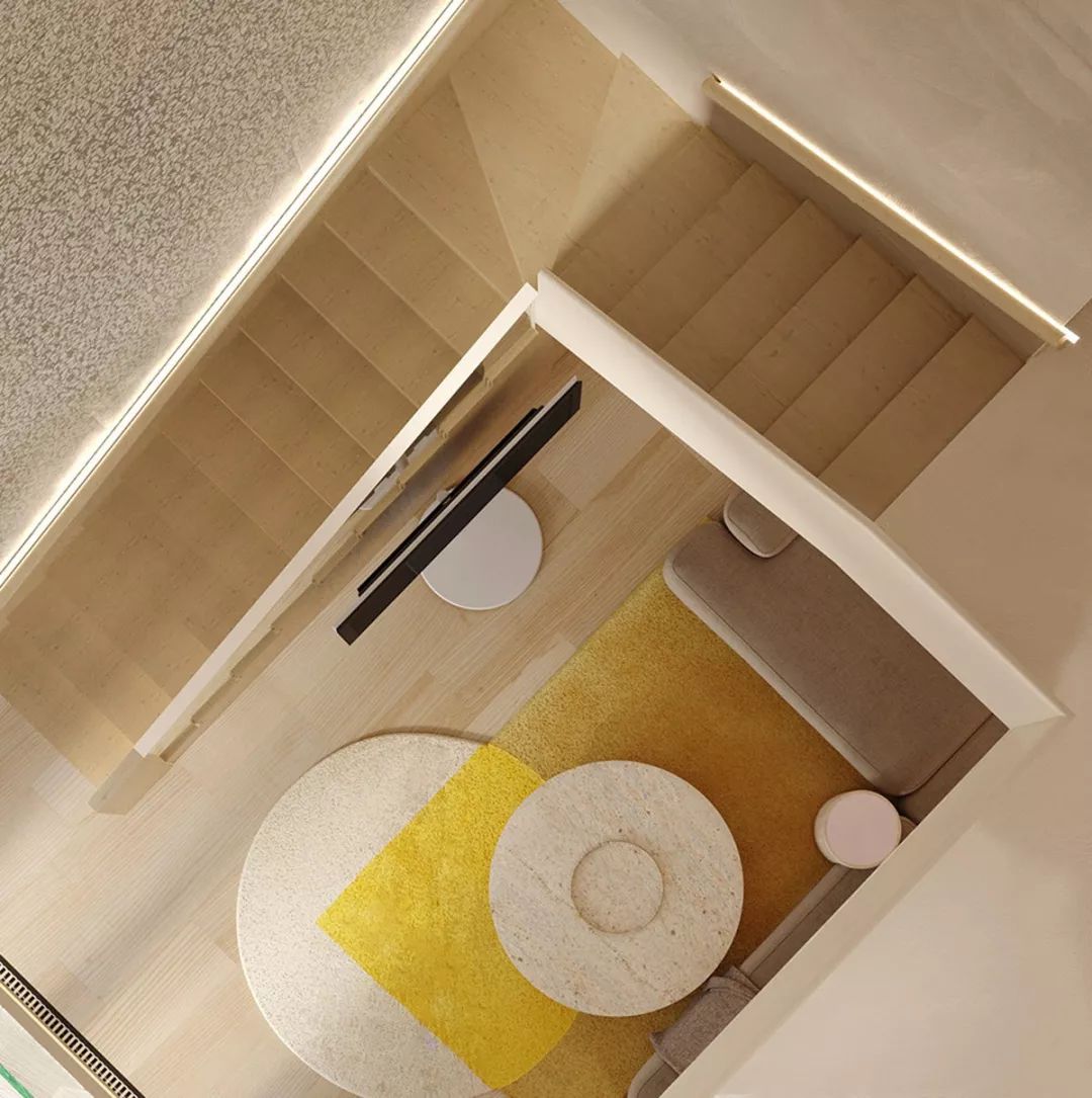 楼梯不仅只是连接上下空间的工具,也可以是家居装修中的一道亮丽的风景。本案楼梯采用光滑的木踏板和带照明的扶手,营造出清爽干净的美感。透过落地区的玻璃栏杆,可以俯瞰下面的休息区,它还允许自然光从落地窗自由流入楼梯间,提升空间的安全性。