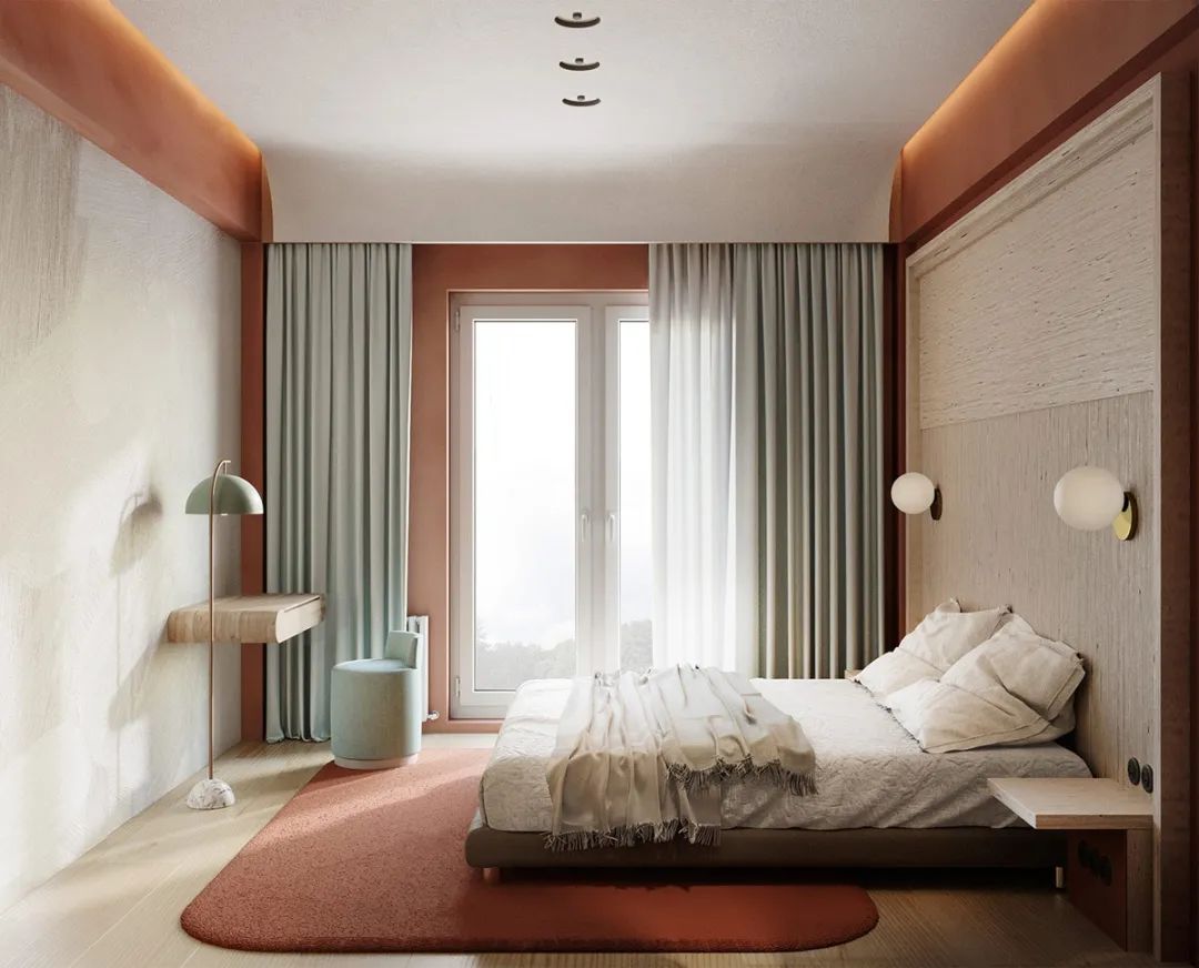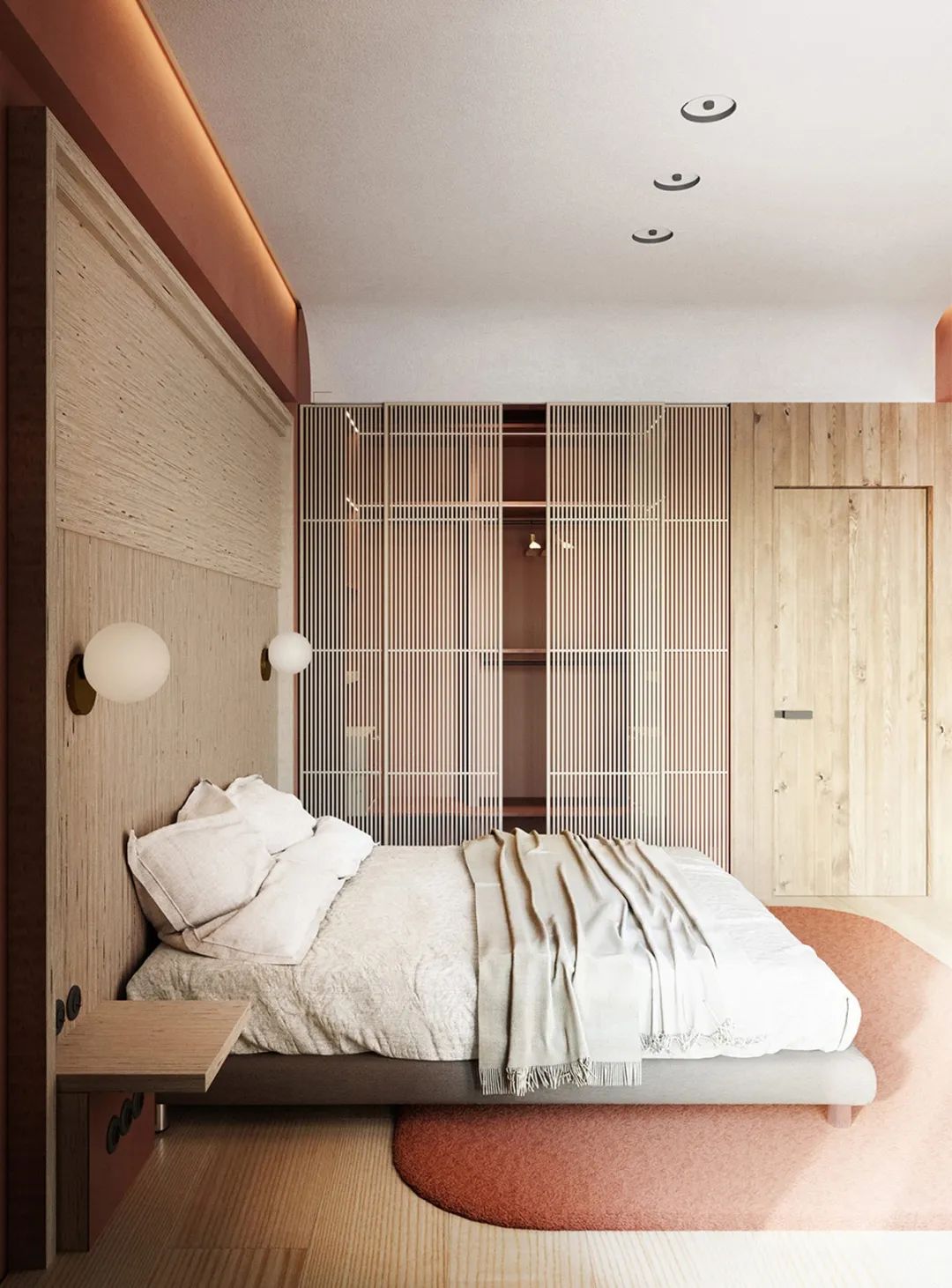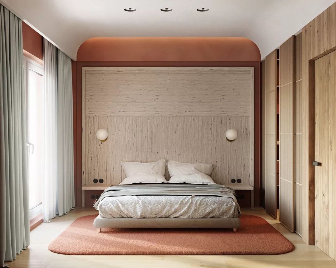 主卧的床头墙是砖红色和浅灰色的组合,视觉上带来温暖的感觉,一组金色现代壁灯照亮床的周围,每天在这里醒来,给人带来一整天的好心情。
