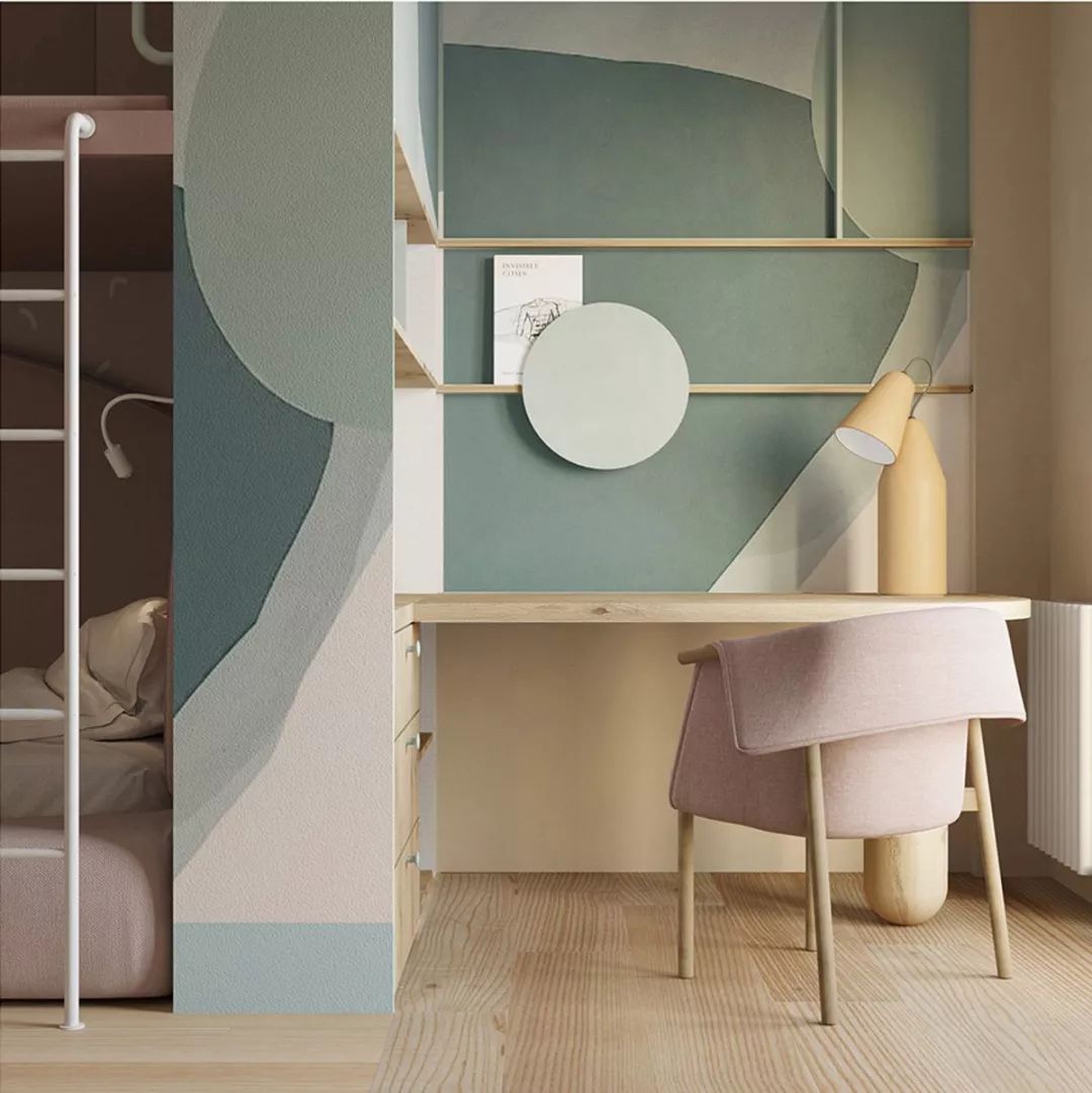 书桌周围的墙壁上有薄荷色的图案,再加上一个独特的台灯,艺术感十足。