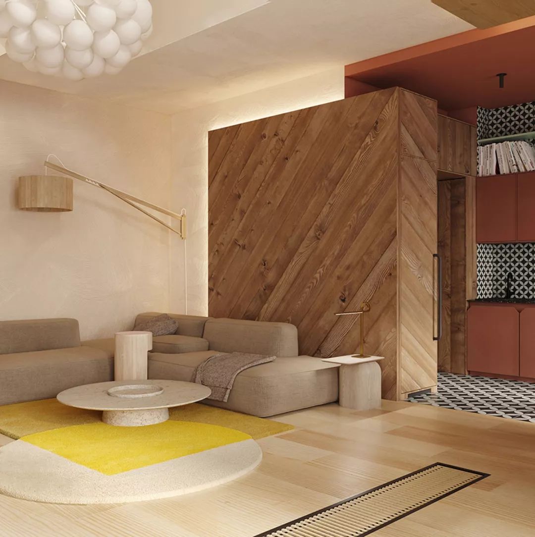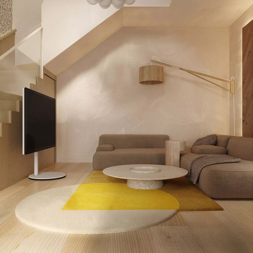 客厅以米色和奶油色为基调,让空间百搭而大气,一个L型的现代灰调沙发靠墙放置,实用又舒适。明黄色的长方形地毯与圆形地毯的温暖色调形成对比,使这个开放式的生活中心让人眼前一亮。一个摆臂壁灯被放置在客厅角落里,满足照亮沙发区域的功能需求,同时也能营造出温馨的氛围。