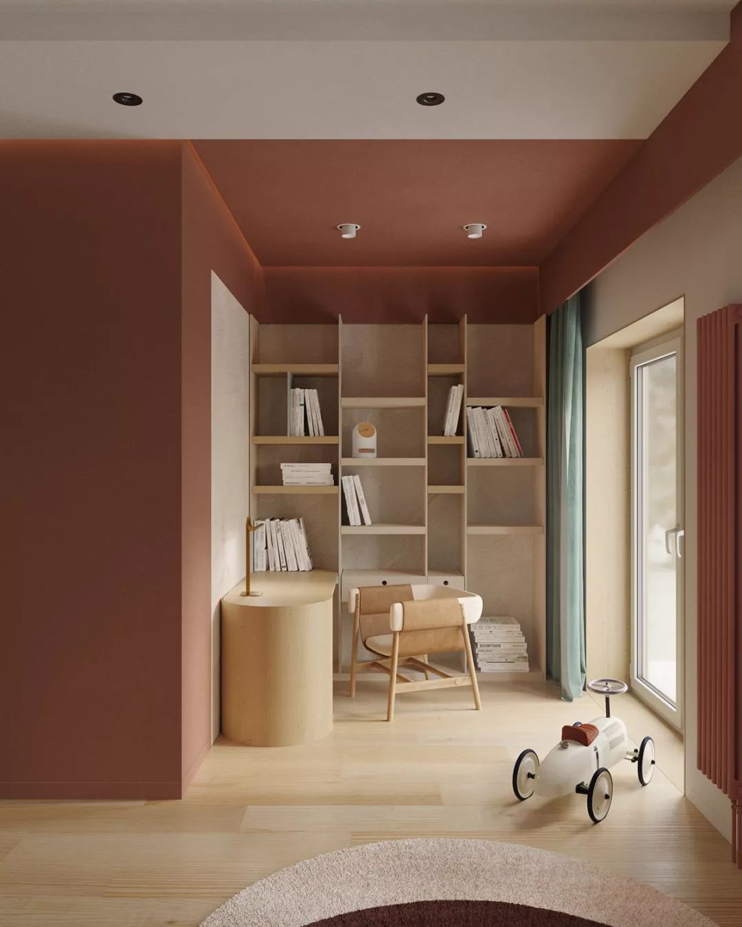 这个空间的另一侧被做成了儿童书房,充满现代设计感的书桌与实用的架子墙融为一体,自然日光从落地窗涌入,照亮了桌子和斯堪的纳维亚风格的椅子。