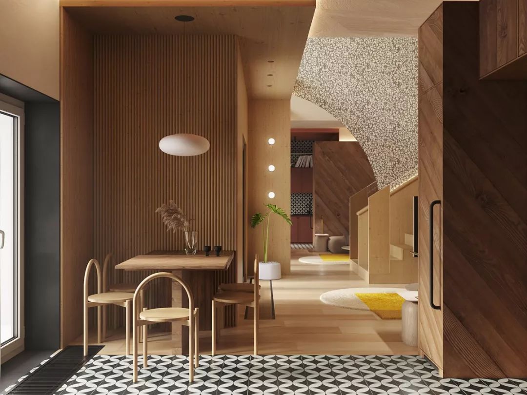 开放式厨房中包括一个用餐区,桌子由多层木材和斜切木板制成,以配合木质特色墙设计,独特的拱形靠背餐椅延续了圆形主题。柔软的潘帕斯草插在玻璃花瓶中,还有一盏精致的餐厅吊灯,几乎是超自然地漂浮在上面,为空间增添一抹艺术的气息。