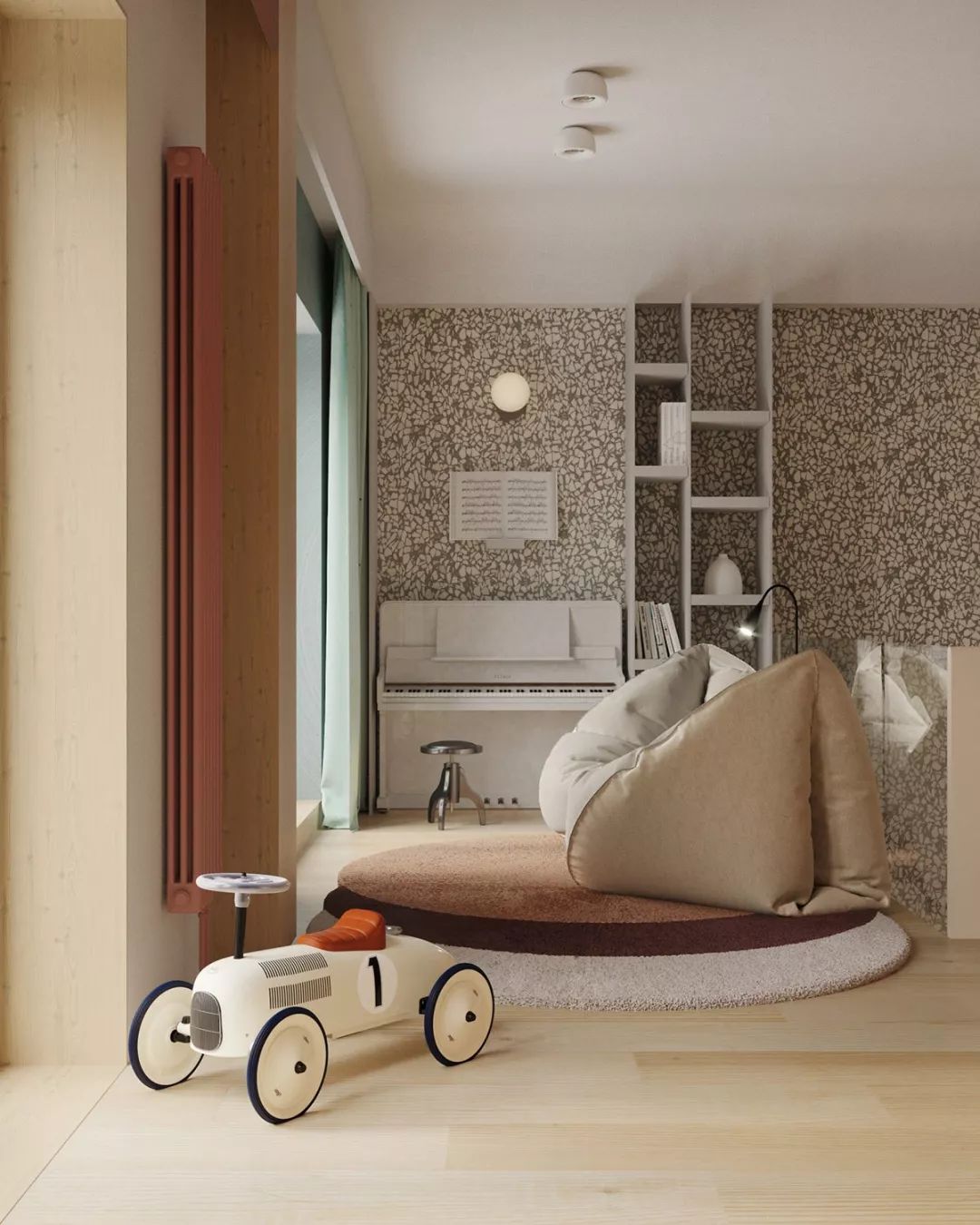 这个亲子活动角的一端形成了一个音乐学习区,学音乐不仅是为了让孩子多一项技能,还可以通过熟记谱面上的各种演奏记号,有助于提升孩子的记忆力。长期练习,会让孩子变得更加沉静,做事更有耐心和毅力。