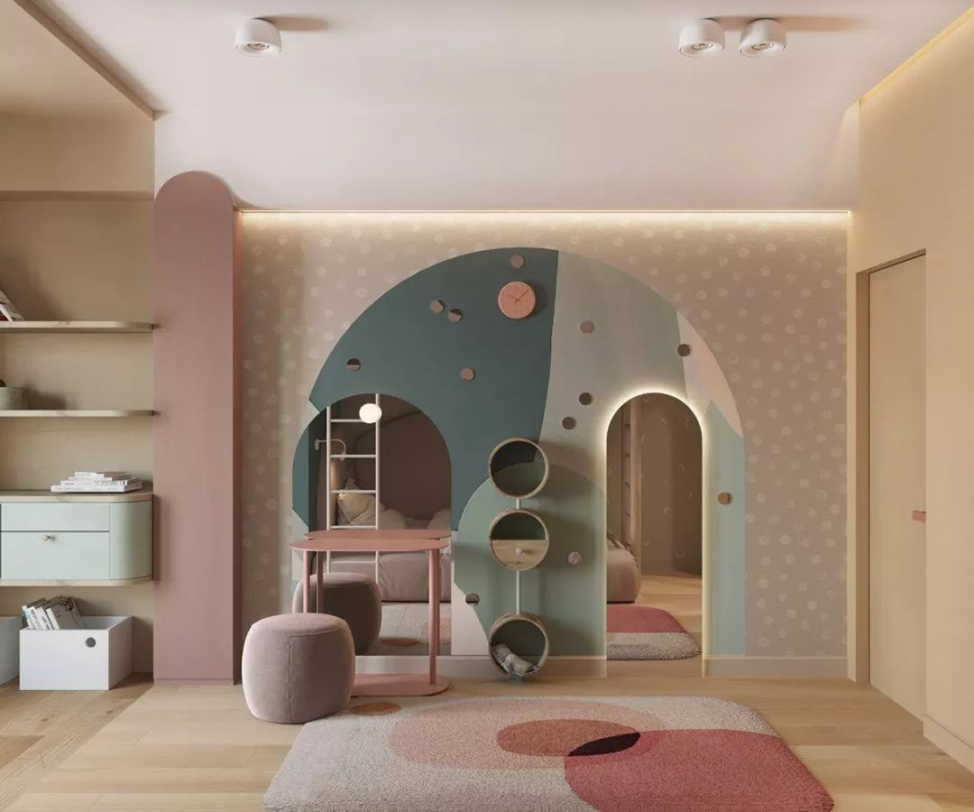 在床的对面墙上,有一个绿色的拱形装饰,包含进一张粉红色的梳妆台和两个镜子的位置,这样的组合创造出了门口的感觉,仿佛通往另一个奇幻的世界。但是对于国内的家庭而言,镜子对床这件事还是要慎重考虑的,可以在床的侧面来一组这样的设计,妙趣横生。